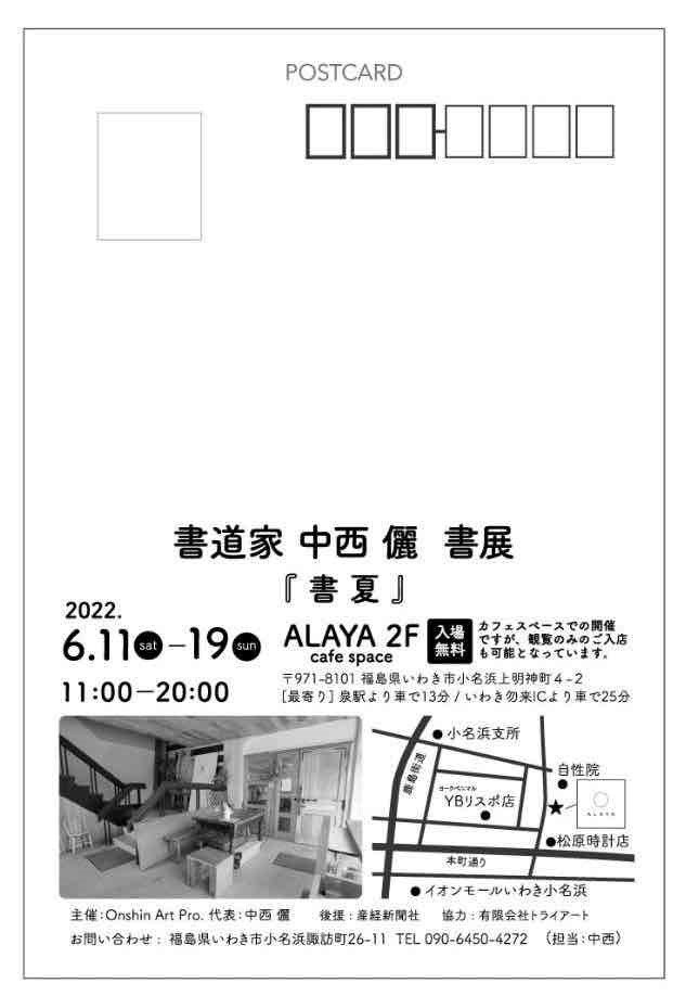 | 展覧会名 会期 会場 団体・代表名 | 中西儷個展 6月11日(土)〜6月19日(日) ALAYA いわき市小名浜(福島県) 中西儷 |
