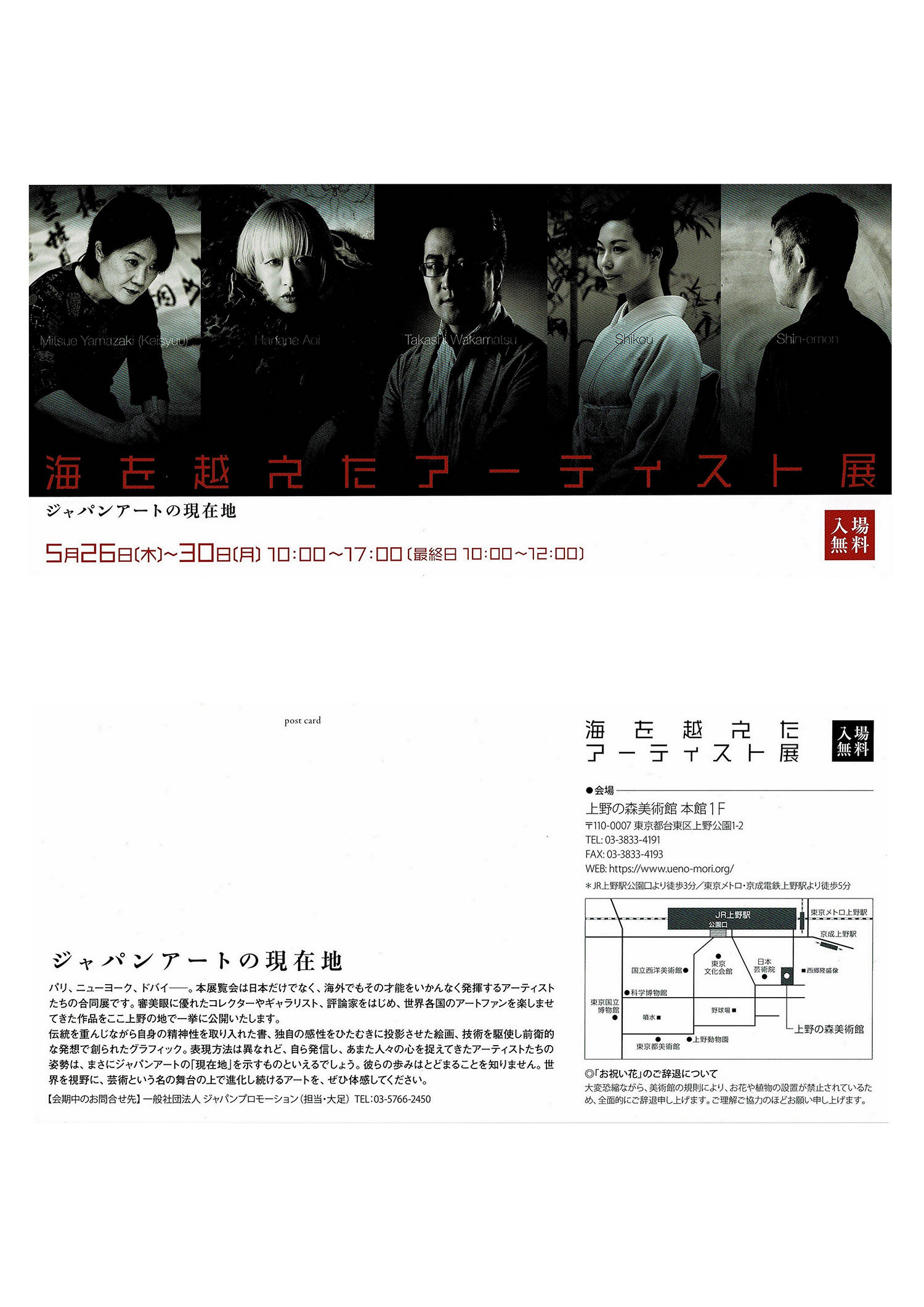| 展覧会名 会期 会場 団体・代表名 | 海を越えたアーティスト展 5月26日(木)〜5月30日(月) 上野の森美術館 山崎佳秀 |