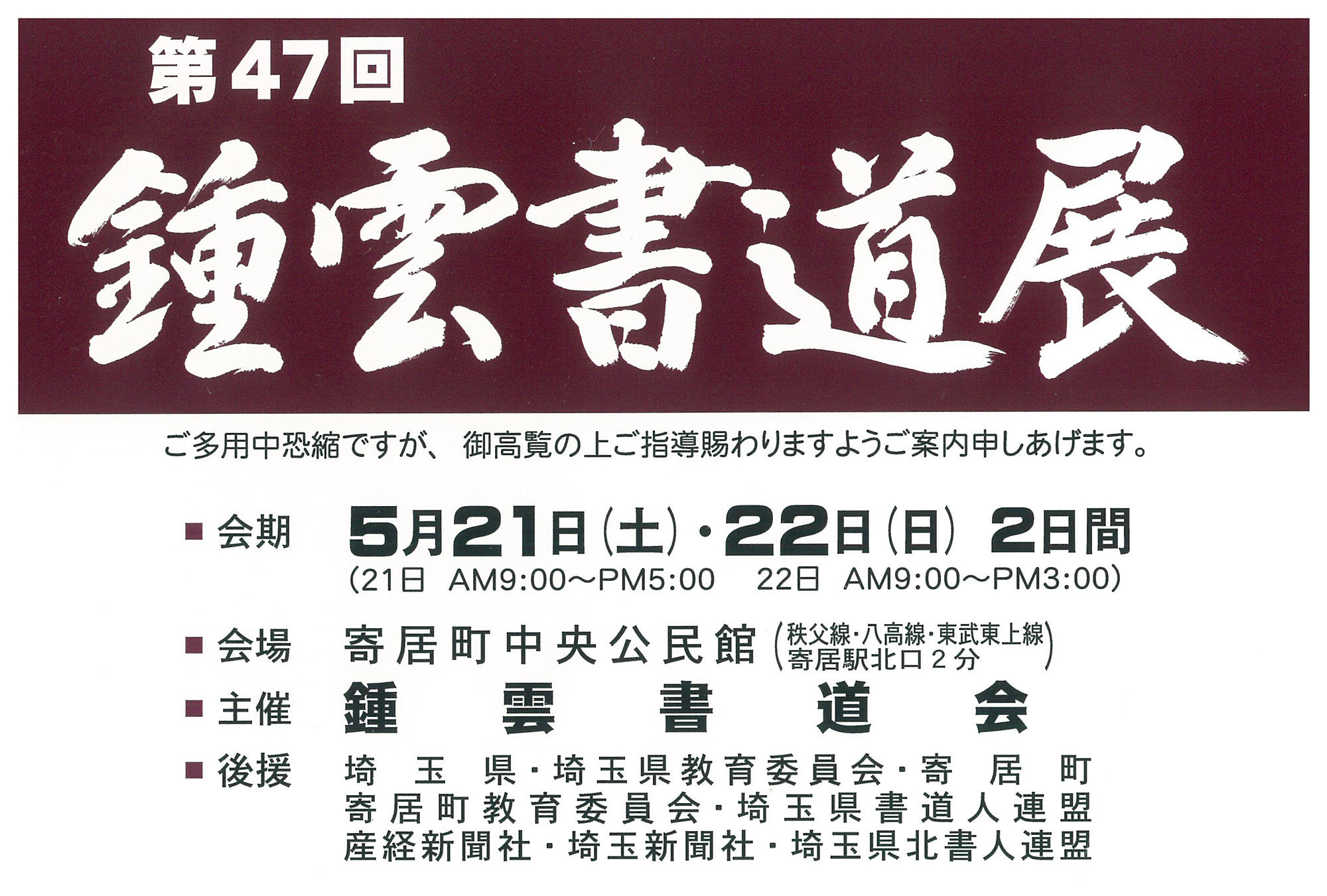 | 展覧会名 会期 会場 団体・代表名 | 第47回 鍾雲書道展 5月21日(土)~5月22日(日) 寄居町中央公民館 鍾雲書道会鍾雲書道会・大澤芳洲 |