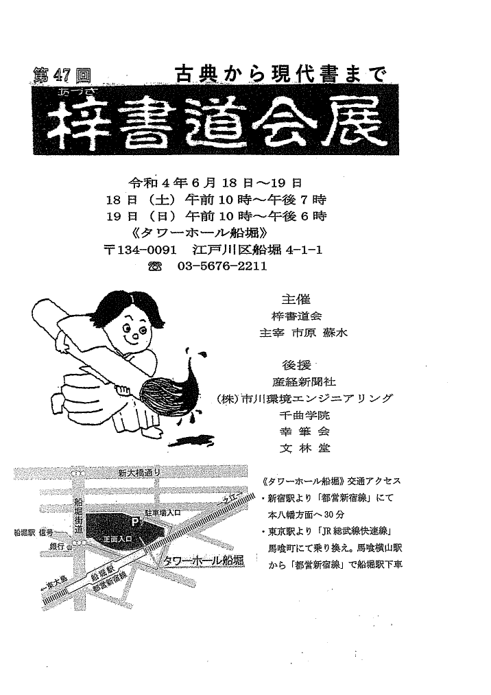 | 展覧会名 会期 会場 団体・代表名 | 第47回梓書道会展 6月18日(土)~19日(日) タワーホール船堀 梓書道会・市原蘇水 |