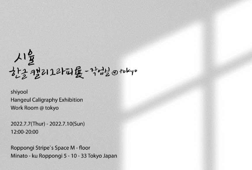 | 展覧会名 会期 会場 団体・代表名 | 崔尹禎ハングルカリグラフィー個展 7月7日(木)〜7月10(日) 六本木ストライプスペース 日本ハングル書芸カリグラフィー協会・崔尹禎 |