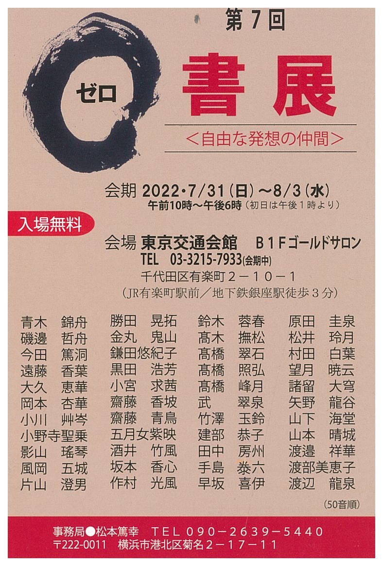 | 展覧会名 会期 会場 団体・代表名 | 第7回ゼロ書展 7月31日(日)~8月3日(水) 東京交通会館B1Fゴールドサロン ゼロ書展運営委員会 |