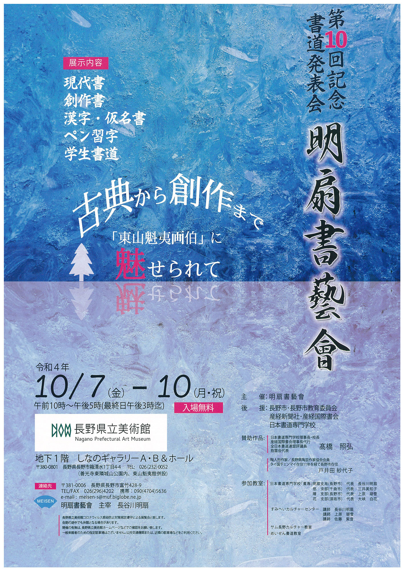 | 展覧会名 会期 会場 団体・代表名 | 明扇書藝會 第10回記念書道発表会 10月7日(金)~10月10日(月) 長野県美術館 明扇書藝會・長谷川明扇 |