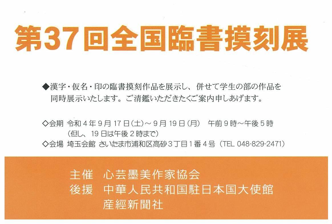 | 展覧会名 会期 会場 団体・代表名 | 第37回 全国臨書摸刻展 9月17日(土)~9月19日(月・祝) 埼玉会館 心芸墨美作家協会・岩浅写心 |