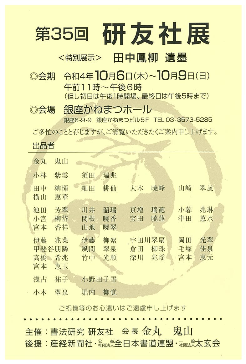 | 展覧会名 会期 会場 団体・代表名 | 第35回研友社展 10月6日(木)~10月9日(日) 銀座かねまつホール 研友社・金丸鬼山 |