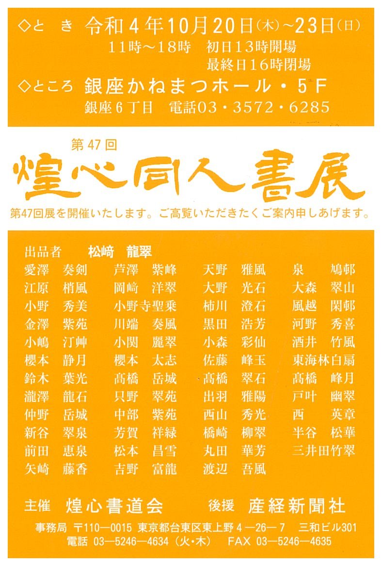 | 展覧会名 会期 会場 団体・代表名 | 第47回煌心同人書展 10月20日(木)~10月23日(日) 銀座かねまつホール 煌心書道会・松﨑龍翠 |