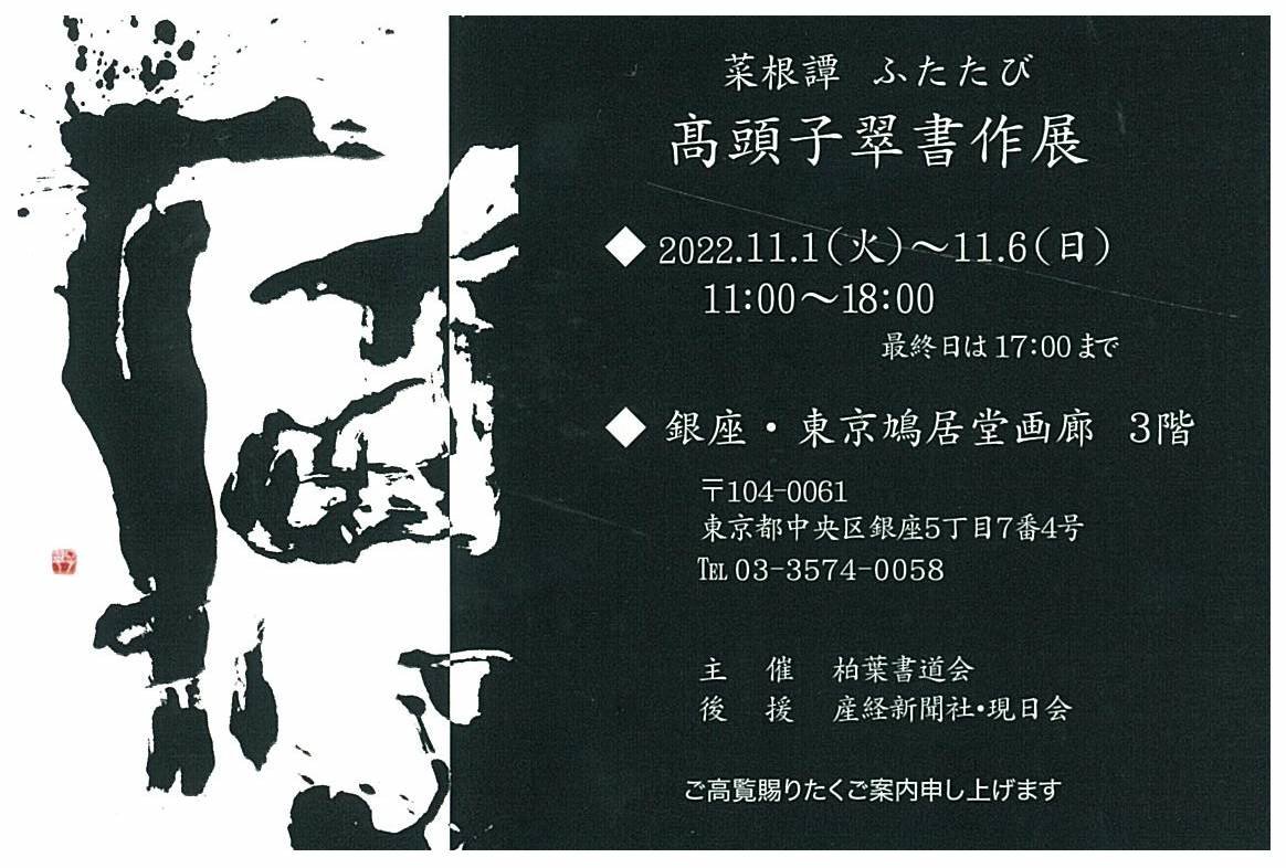| 展覧会名 会期 会場 団体・代表名 | 髙頭子翠書作展 11月1日(火)~11月6日(日) 鳩居堂3階画廊 柏葉書道会・髙頭子翠 |