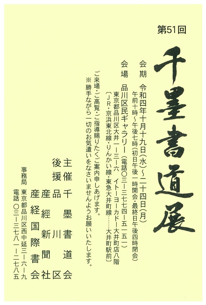 | 展覧会名 会期 会場 団体・代表名 | 第51回千墨書道展 10月19日(水)~10月24日(日) 品川区民ギャラリー 千墨書道会・近藤豊泉 |
