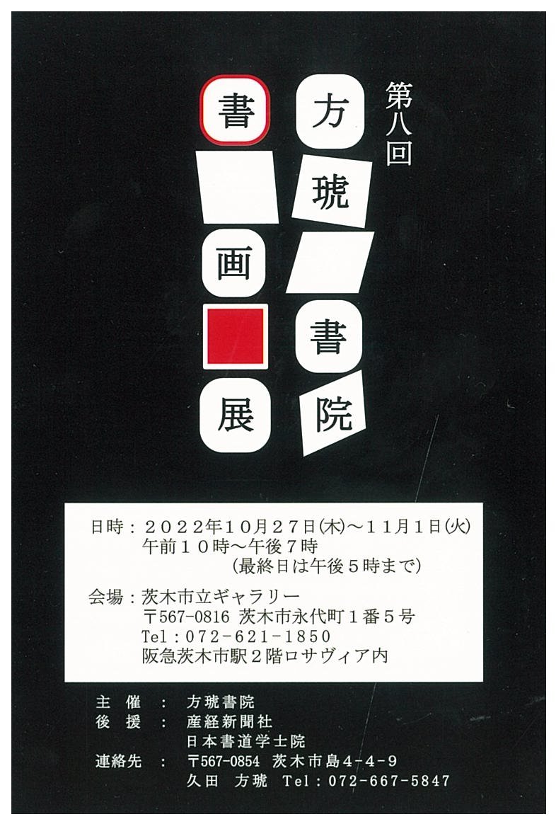 | 展覧会名 会期 会場 団体・代表名 | 第8回方琥書院書画展 10月27日(木)~11月1日(火) 茨木市立ギャラリー 方琥書院・久田方琥 |
