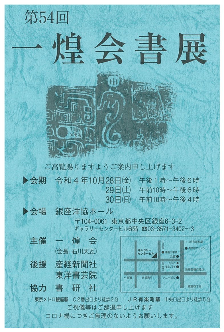 | 展覧会名 会期 会場 団体・代表名 | 第54回一煌会書展 10月28日(金)~10月30日(日) 銀座洋協ホール 石川天瓦・一煌会 |