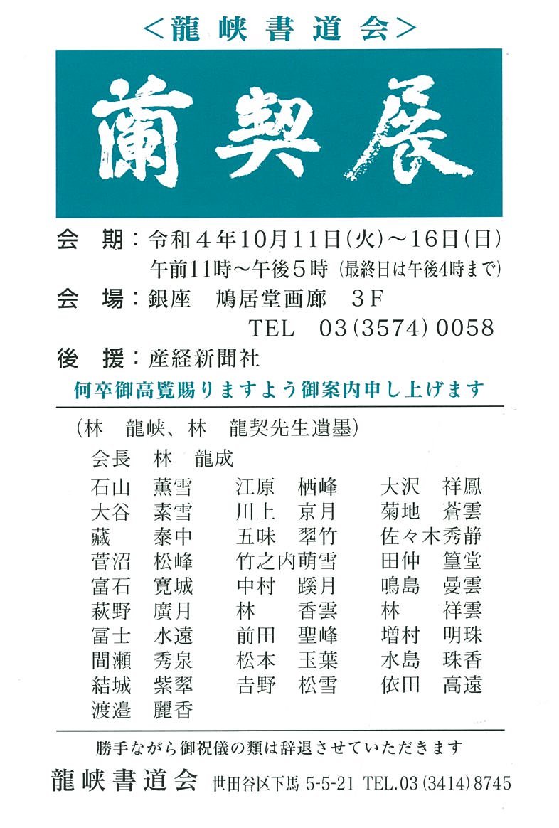 | 展覧会名 会期 会場 団体・代表名 | 第28回龍峡書道金蘭契展 10月11日(火)~10月16日(日) 銀座鳩居堂画廊3階 龍峡書道会・林龍成 |