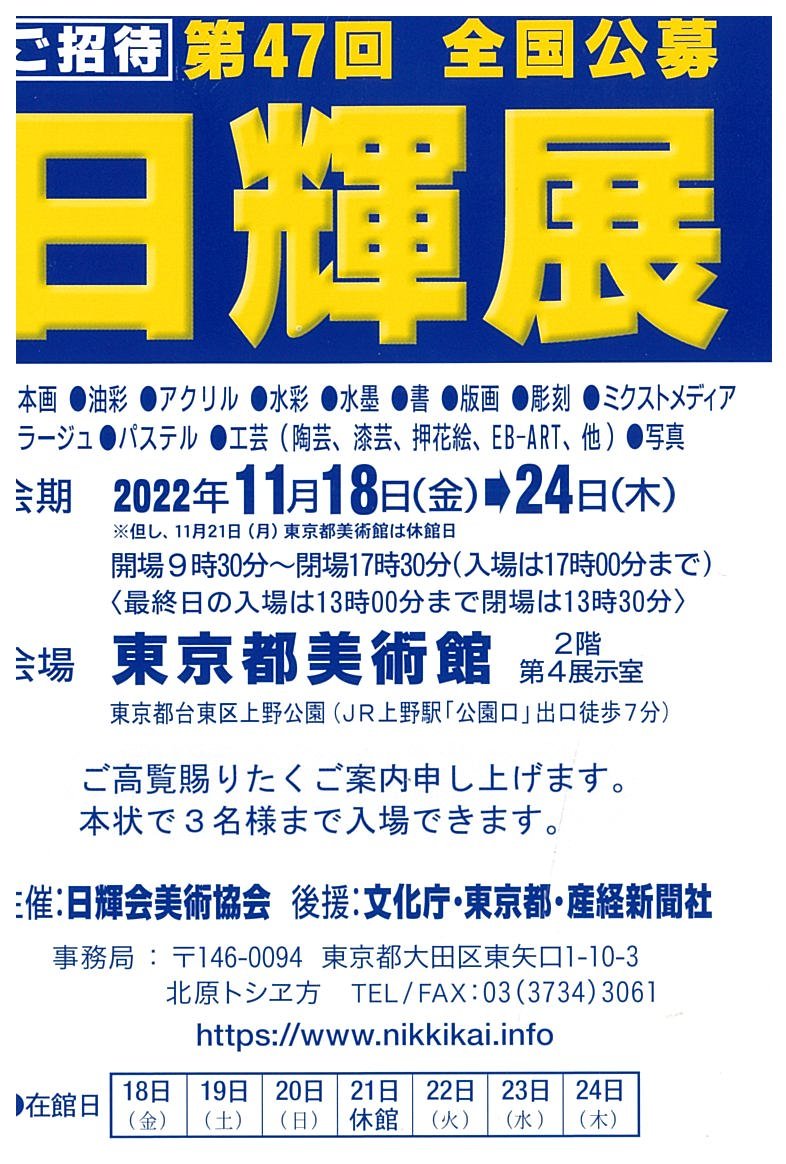 | 展覧会名 会期 会場 団体・代表名 | 第47回日輝展 11月18日(金)~11月24日(木) 東京都美術館 日輝会美術協会・石井理春 |