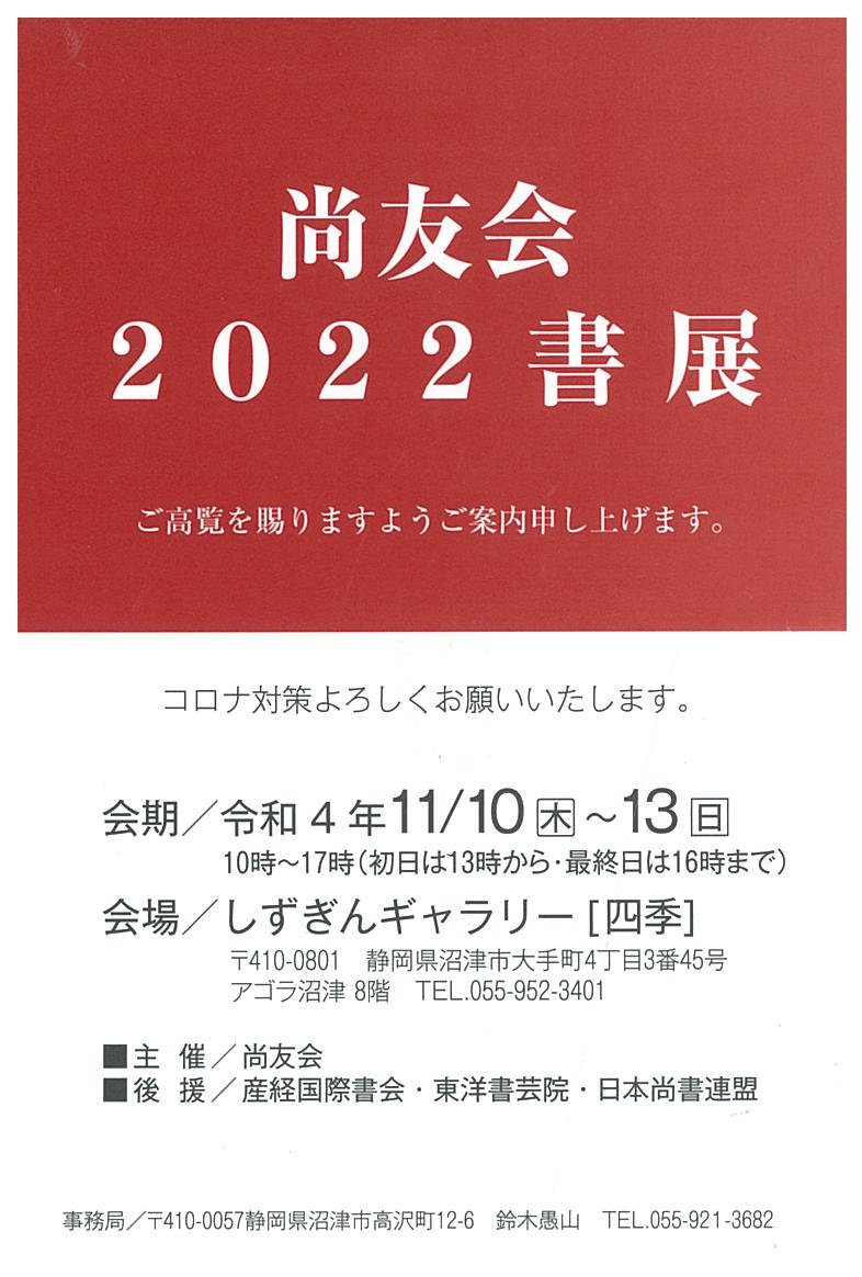 | 展覧会名 会期 会場 団体・代表名 | 尚友会2022書展 11月10日(木)~11月13日(日) しずぎんギャラリー[四季] 尚友会・小杉修史 |