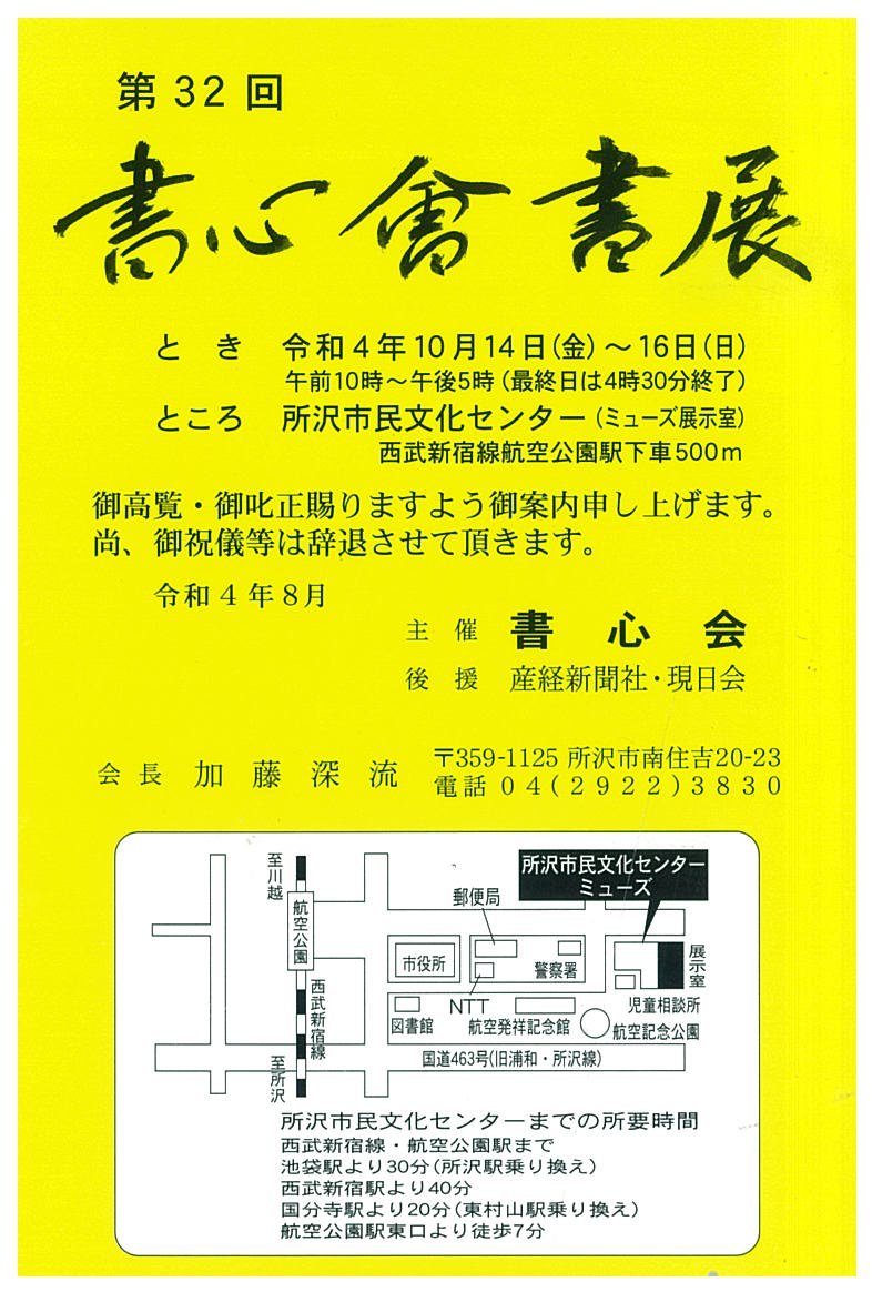 | 展覧会名 会期 会場 団体・代表名 | 第32回書心会書展 10月14日(金)~10月16日(日) 所沢市民文化センター(ミューズ) 書心会・加藤深流 |