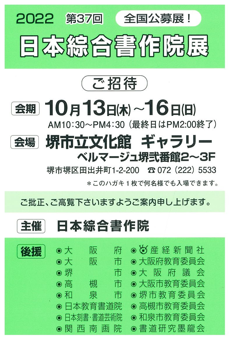 | 展覧会名 会期 会場 団体・代表名 | 第37回日本綜合書作院展 10月13日(木)~10月16日(日) 堺市立文化館アルフォンス・ミュシャ館 日本綜合書作院・篠原秀朋 |