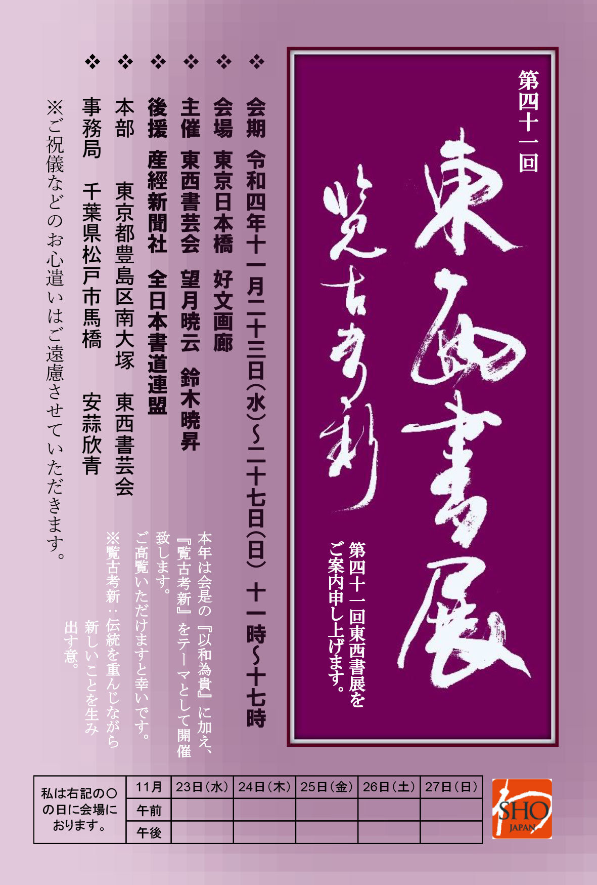 | 展覧会名 会期 会場 団体・代表名 | 第41回東西書展 11月23日(水)~11月27日(日) 日本橋・好文画廊 東西書芸会 望月暁云 鈴木暁昇 |