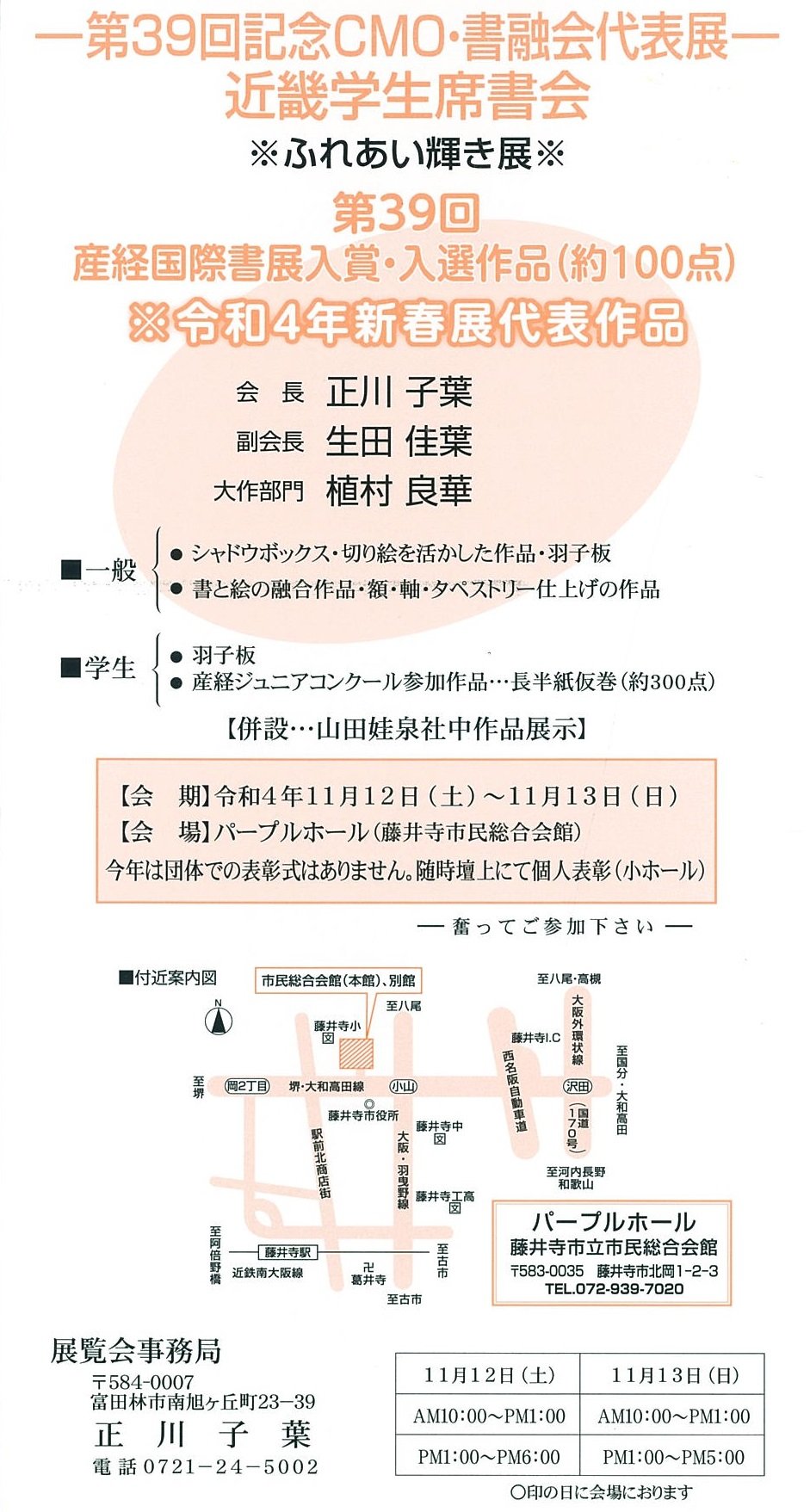 | 展覧会名 会期 会場 団体・代表名 | -第39回記念CMO・書融会代表展-近畿学生席書会 11月12日(土)~11月13日(日) 藤井寺市民総合会館 書融会・正川子葉 |