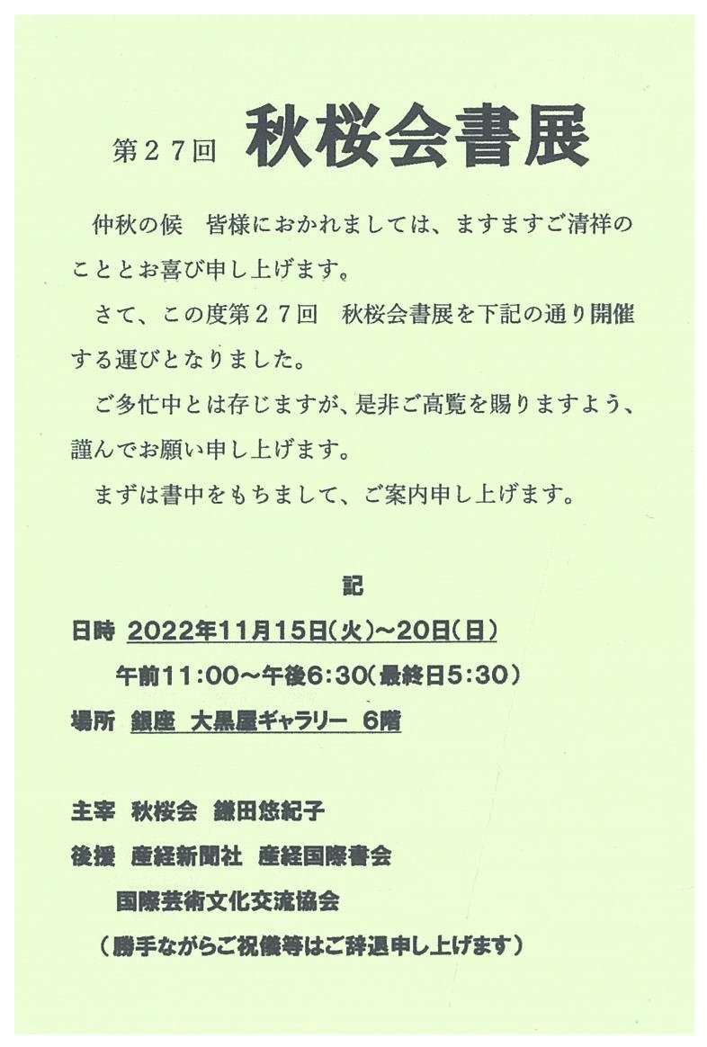 | 展覧会名 会期 会場 団体・代表名 | 第27回秋桜会書展 11月15日(火)~11月20日(日) 銀座・大黒屋ギャラリー 秋桜会・鎌田悠紀子 |