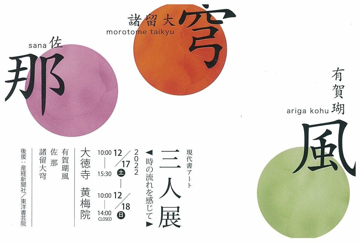 | 展覧会名 会期 会場 団体・代表名 | 現代書アート三人展 12月17日(土)~12月18日(日) 大徳寺黄梅院(京都府) 諸留大穹 |