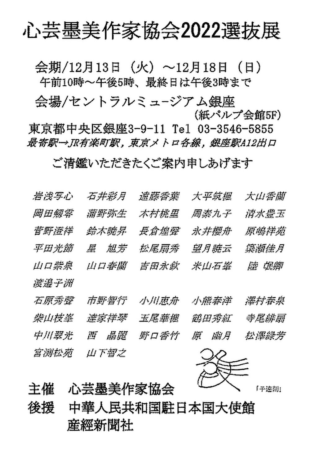 | 展覧会名 会期 会場 団体・代表名 | 心芸墨美作家協会2022選抜展 12月13日(火)~12月18日(日) セントラルミュージアム銀座 心芸墨美作家協会・岩浅写心 |