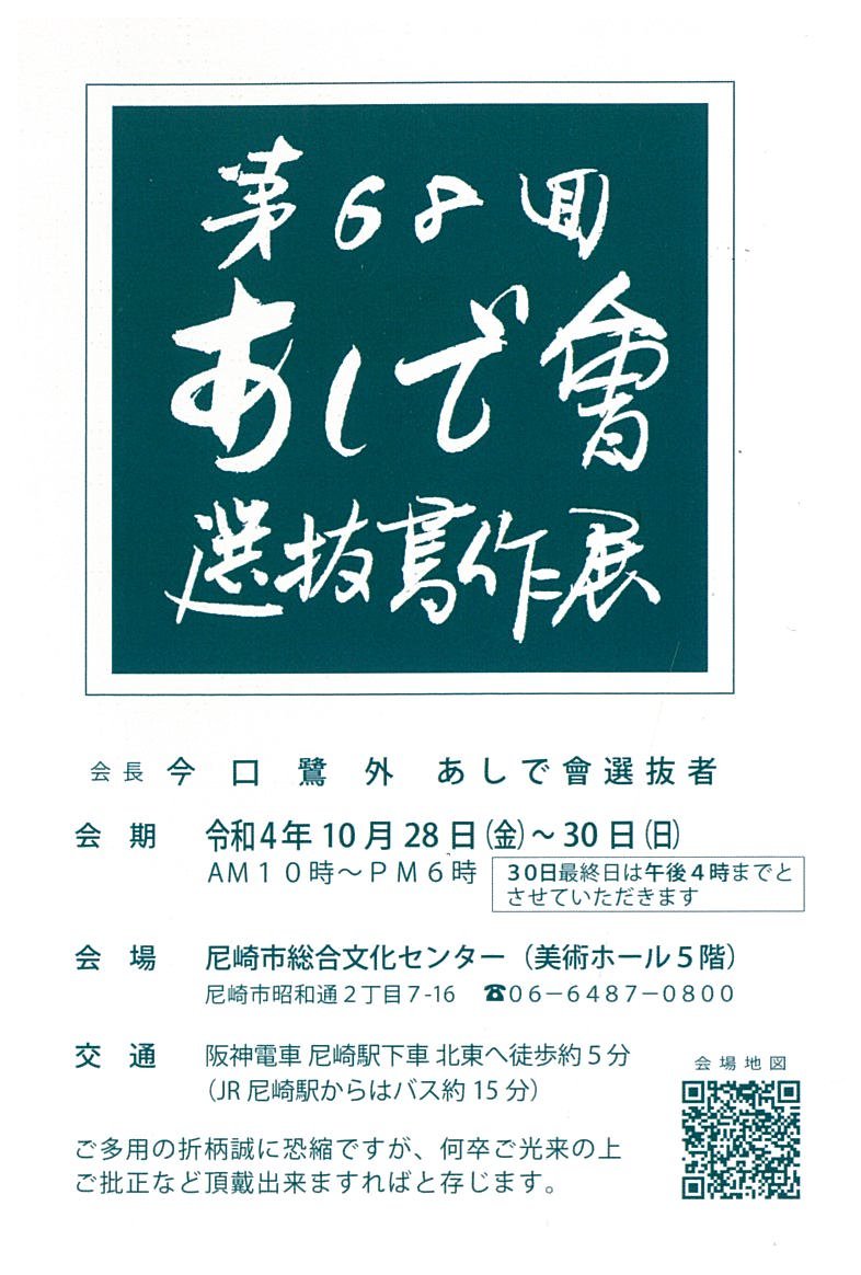 | 展覧会名 会期 会場 団体・代表名 | 第68回あしで會選抜書作展 10月28日(金)~10月30日(日) 尼崎市総合文化センター 美術ホール5階 あしで會・今口鷺外 |