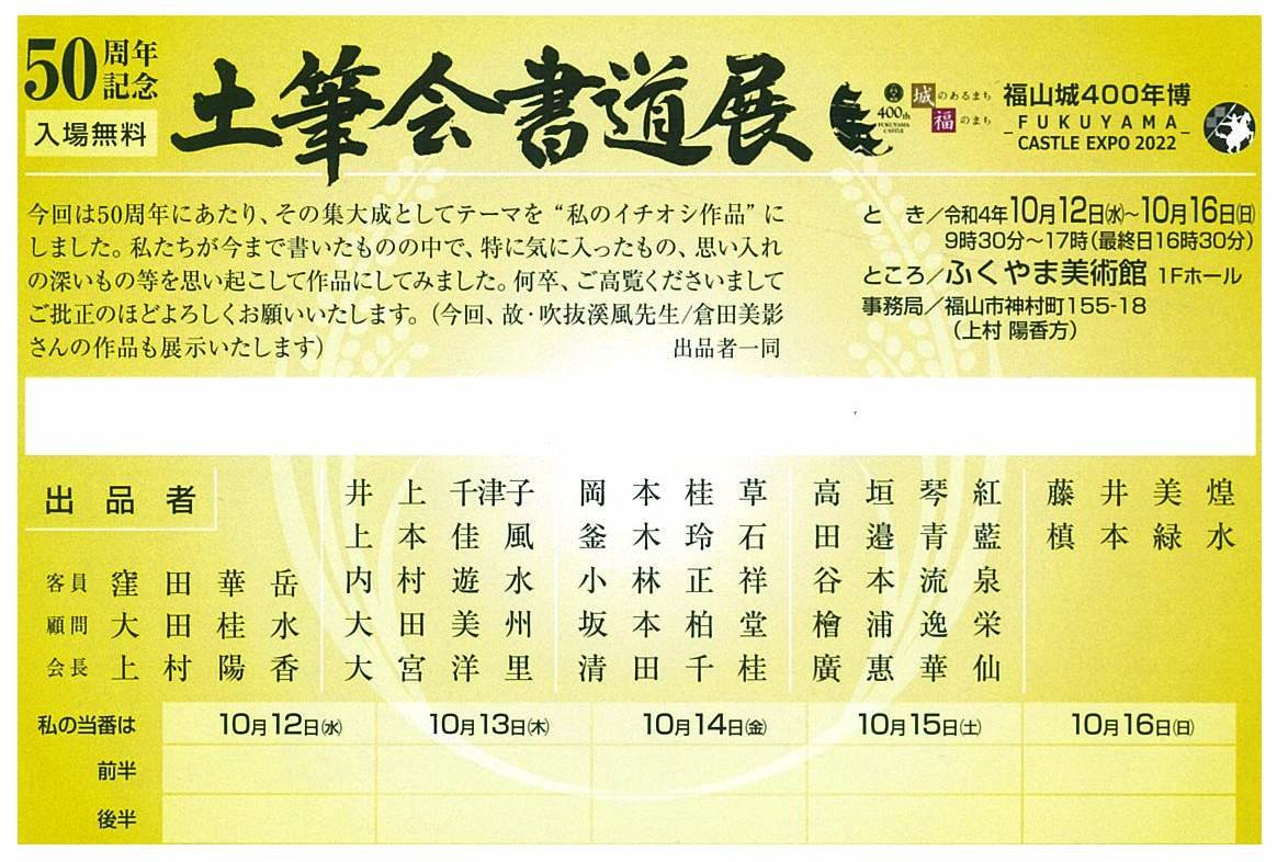 | 展覧会名 会期 会場 団体・代表名 | 50周年記念 土筆会書道展 10月12日(水)~10月16日(日) ふくやま美術館 1Fホール 土筆会・上村陽香 |