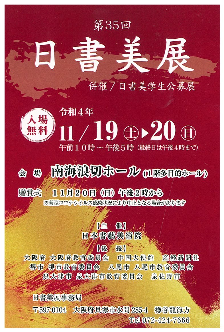 | 展覧会名 会期 会場 団体・代表名 | 第35回 日書美展 11月19日(土)~11月20日(日) 南海波切ホール 日本書芸美術院・太田春麗 |