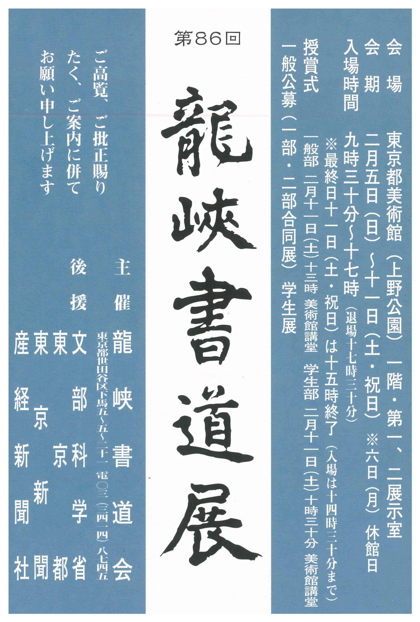 | 展覧会名 会期 会場 団体・代表名 | 第86回龍峡書道会 2月5日(日)~2月11日(土) 東京都美術館 龍峡書道会・林龍成 |