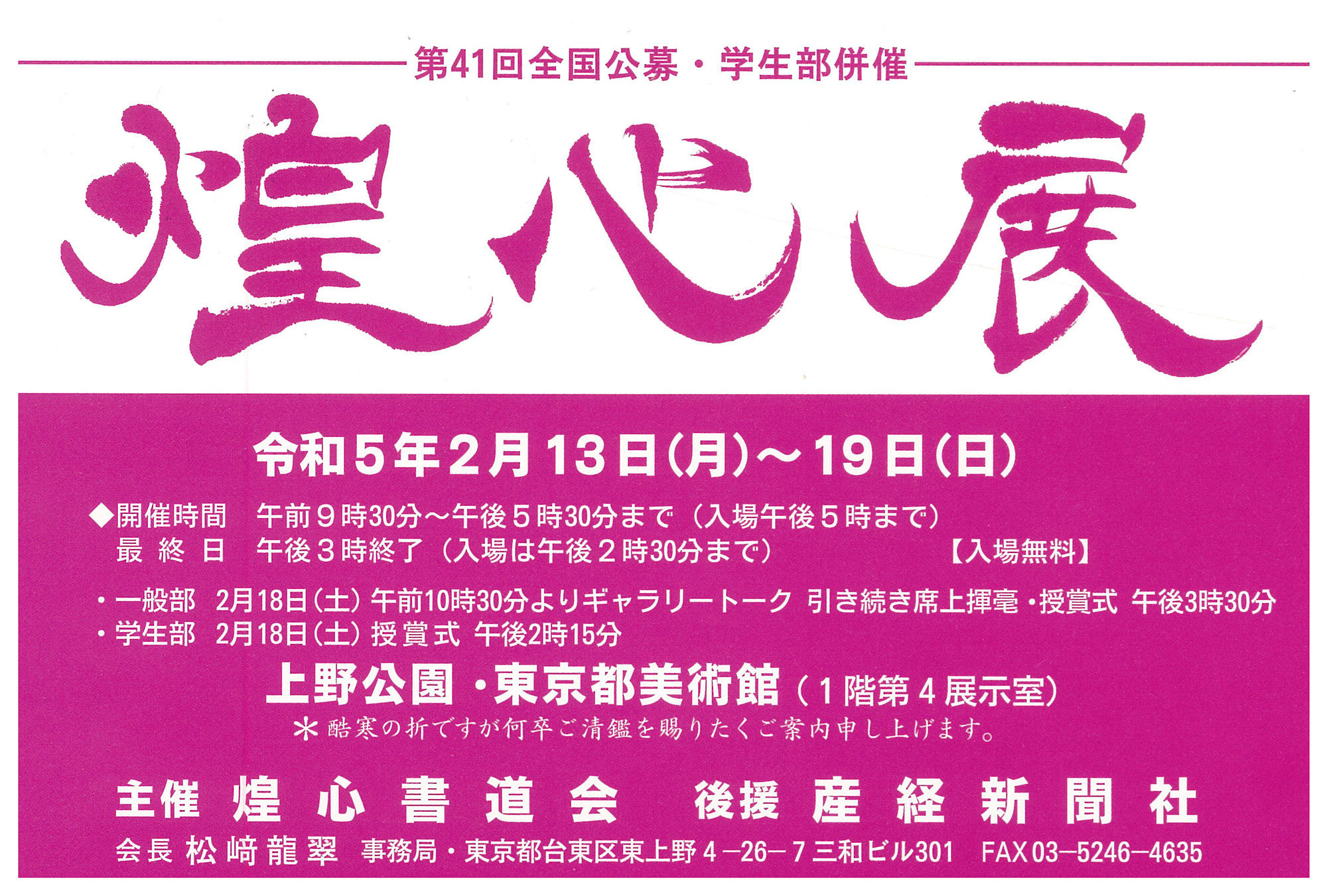 | 展覧会名 会期 会場 団体・代表名 | 第41回全国公募・学生部併催煌心展 2月13日(月)~2月19日(日) 東京都美術館 煌心書道会・松﨑龍翠 |