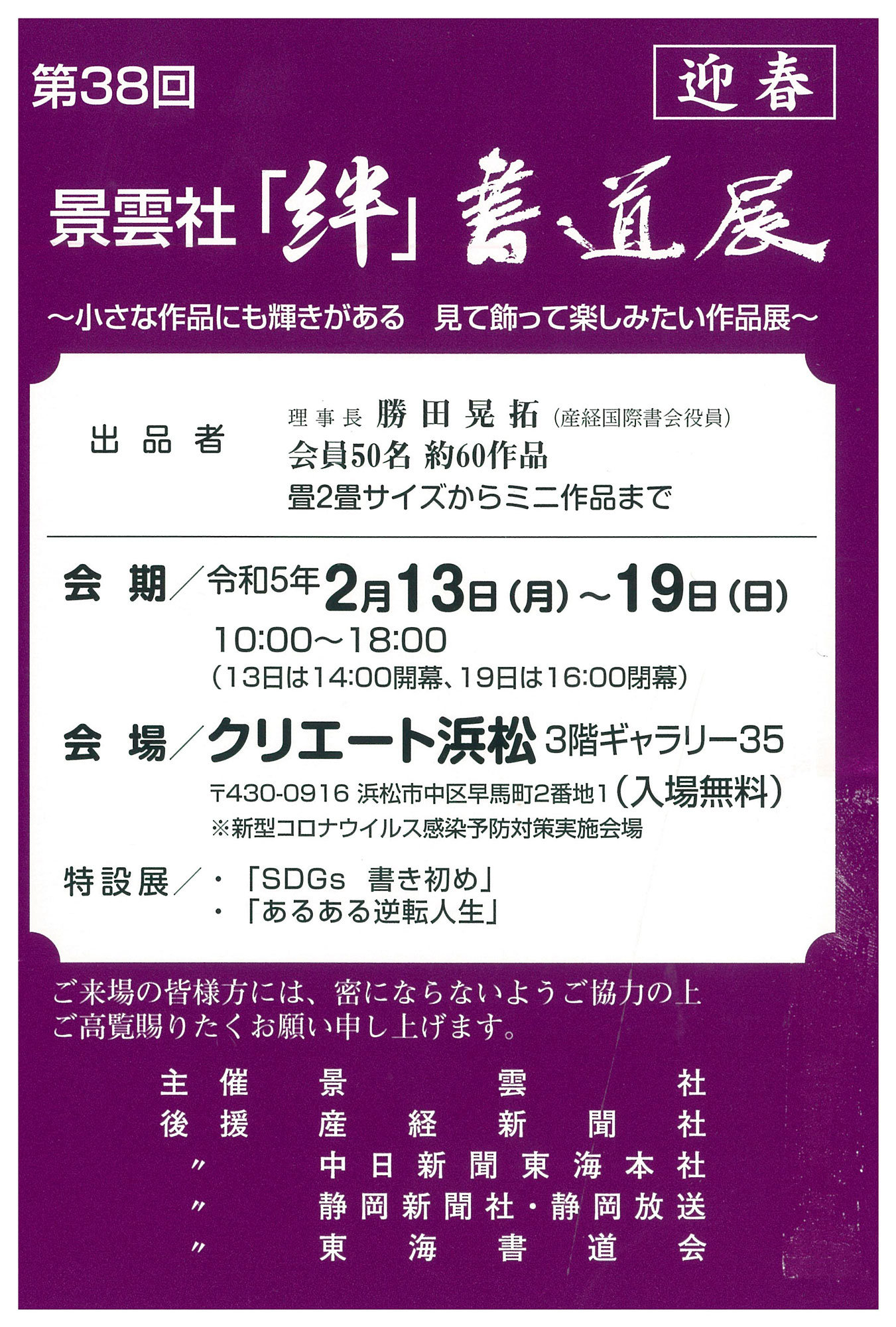 | 展覧会名 会期 会場 団体・代表名 | 第38回景雲社「絆」書道展 2月13日(月)~2月19日(日) クリエート浜松ギャラリー35 景雲社・勝田晃拓 |