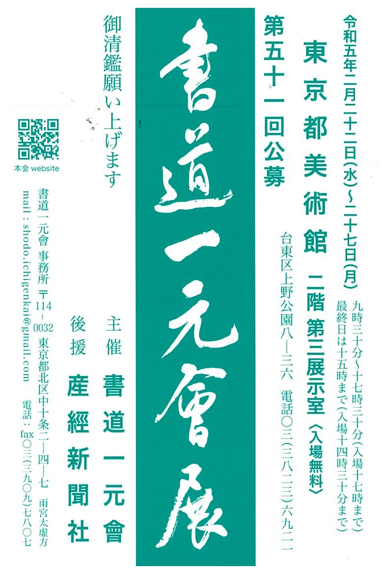 | 展覧会名 会期 会場 団体・代表名 | 第51回公募書道一元會展 2月22日(水)~2月27日(月) 東京都美術館 書道一元會・齊藤雪石 |