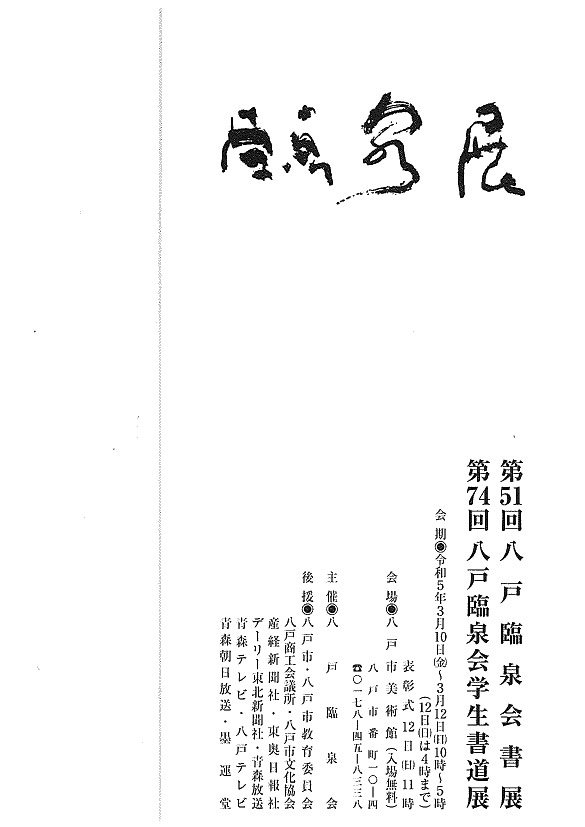 | 展覧会名 会期 会場 団体・代表名 | 第51回八戸臨泉会書展 第74回八戸臨泉会学生書道展 3月10日(金)~3月12日(日) 八戸市美術館 臨泉会・原田圭泉 |