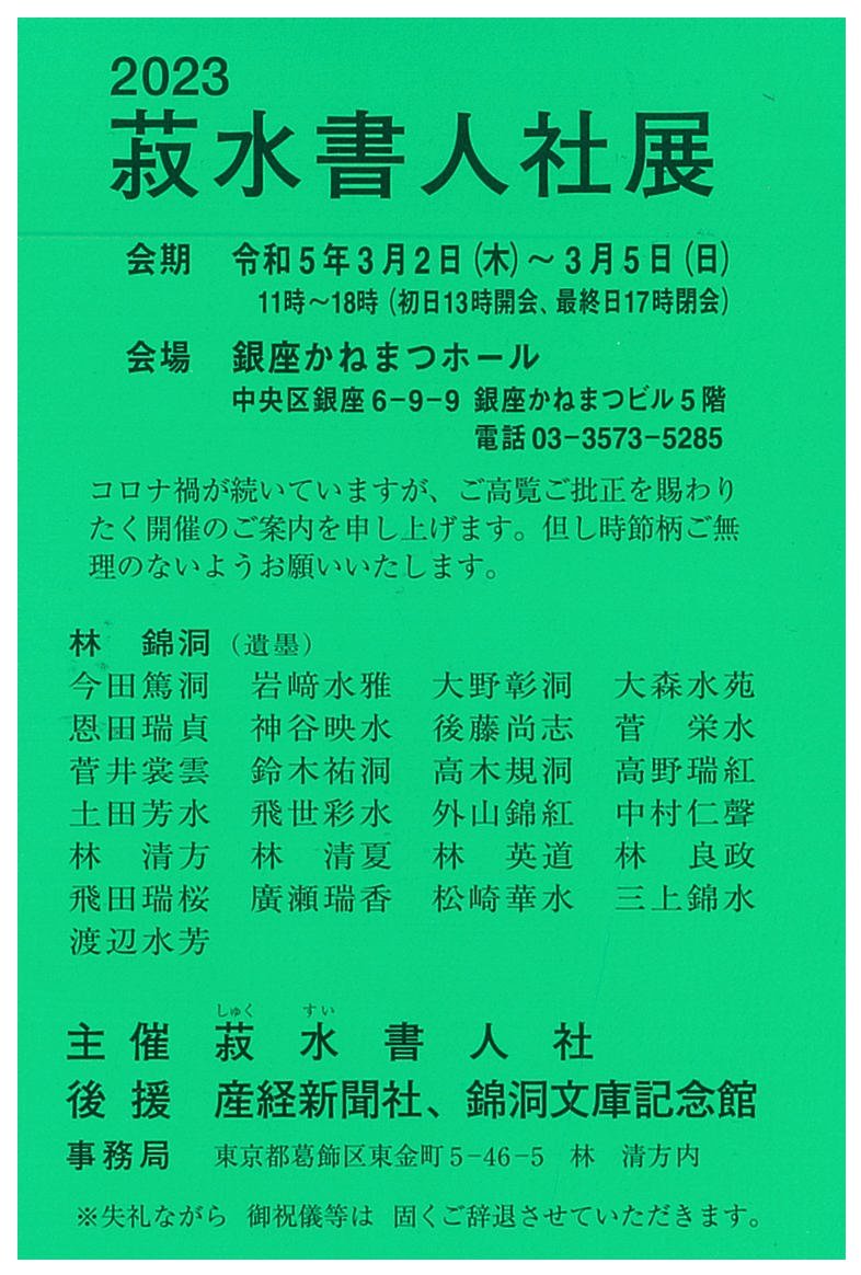 | 展覧会名 会期 会場 団体・代表名 | 2023菽水書人社展 3月2日(木)~3月5日(日) 銀座かねまつホール 菽水書人社・林清方 |