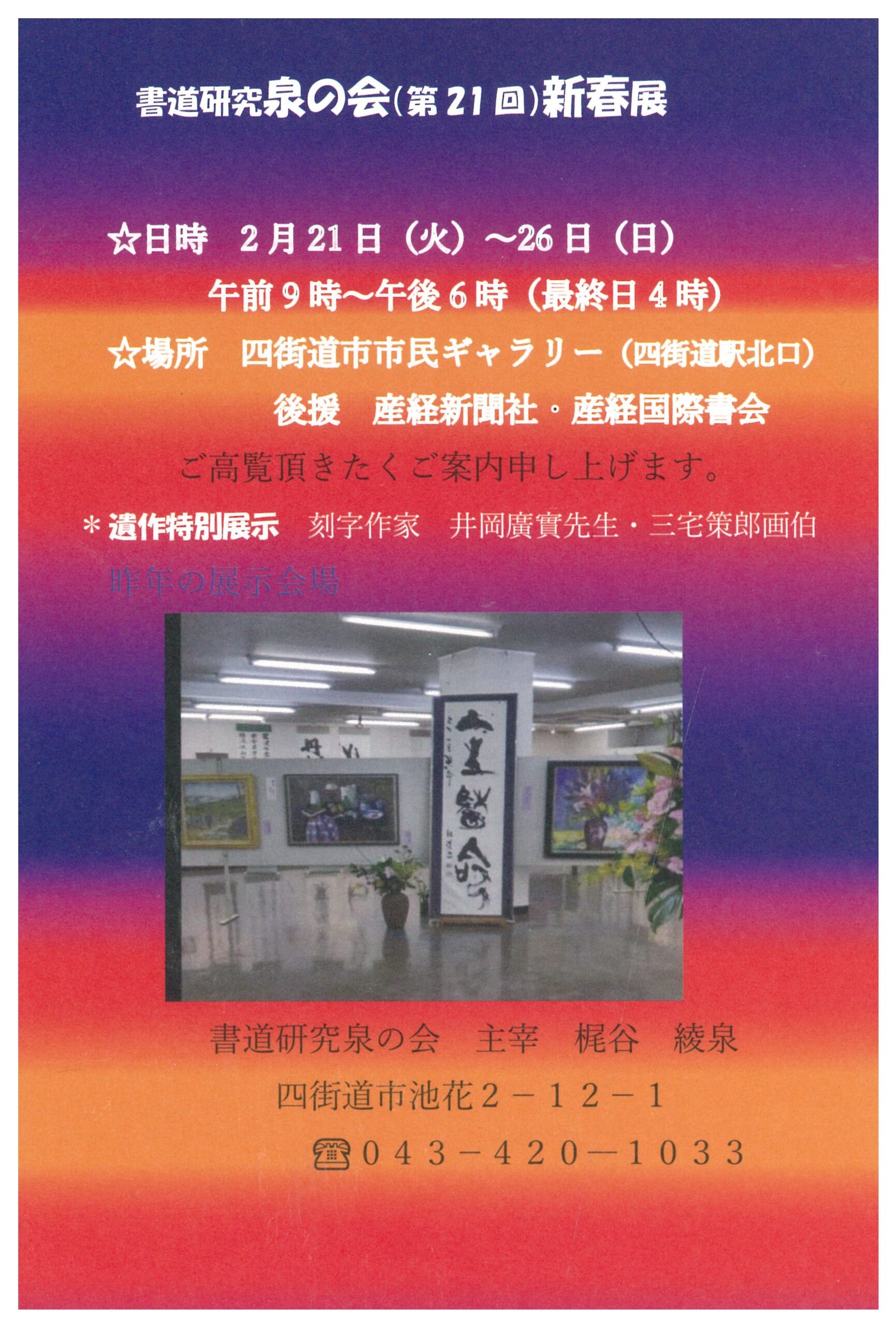 | 展覧会名 会期 会場 団体・代表名 | 書道研究泉の会(第21回)新春展 2月21日(火)~2月26日(日) 四街道市市民ギャラリー 泉の会・梶谷綾泉 |