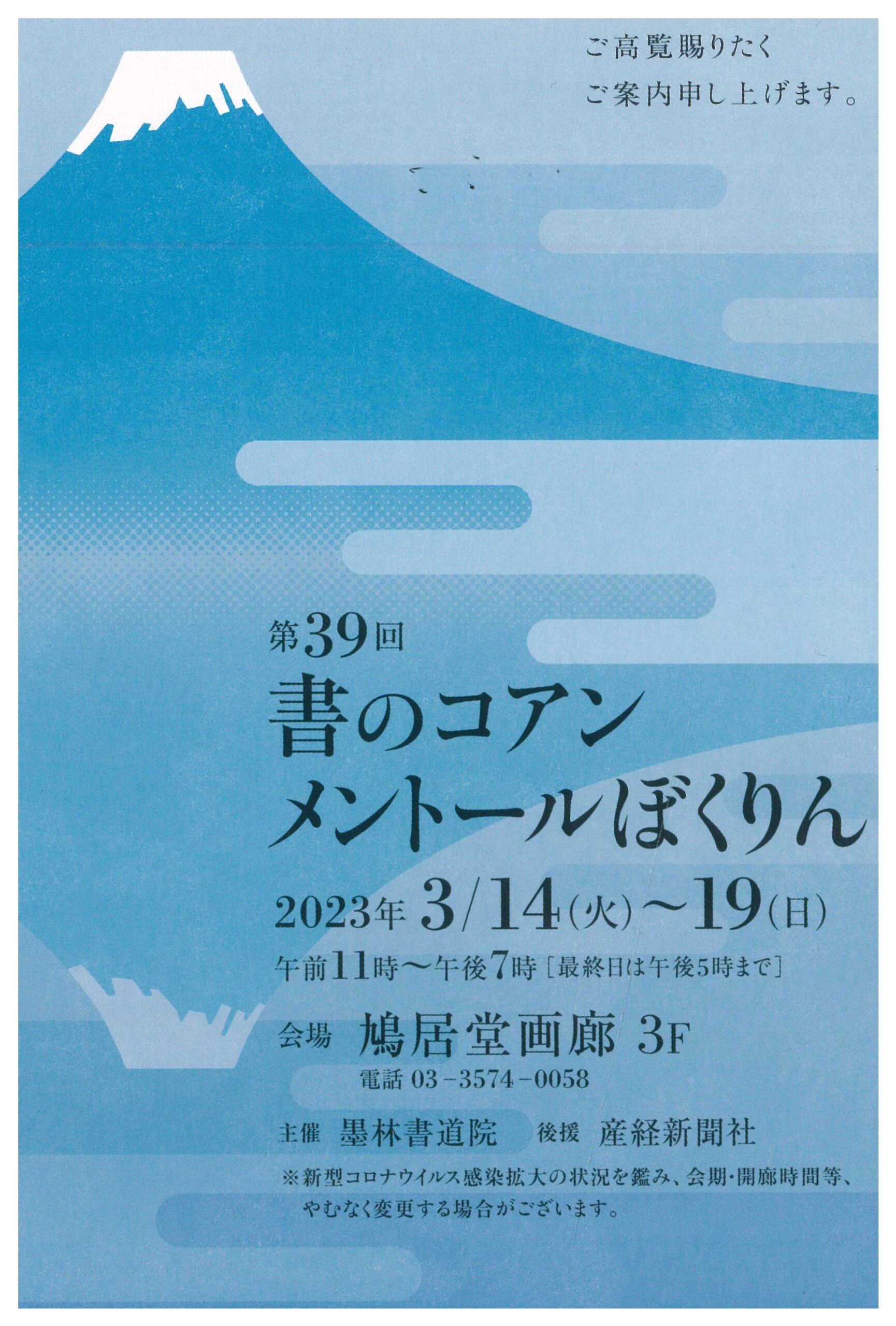 | 展覧会名 会期 会場 団体・代表名 | 第39回書のコアンメントールぼくりん 3月14日(火)~3月19日(日) 鳩居堂画廊3階 墨林書道院・遠藤乾翠 |