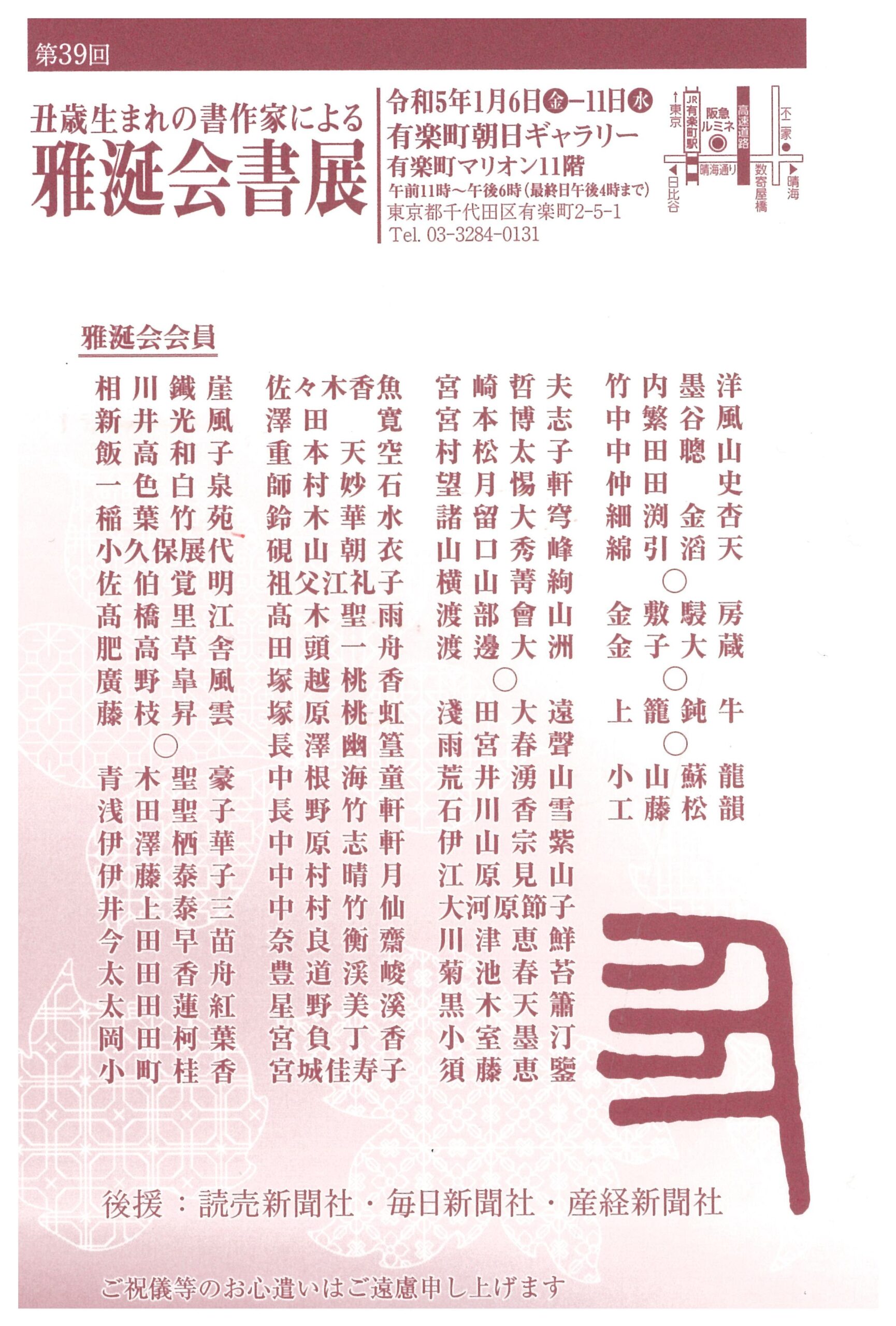 | 展覧会名 会期 会場 団体・代表名 | 第39回雅涎会書展 1月6日(金)~1月11日(日) 有楽町朝日ギャララリー 事務局・一色白泉 |