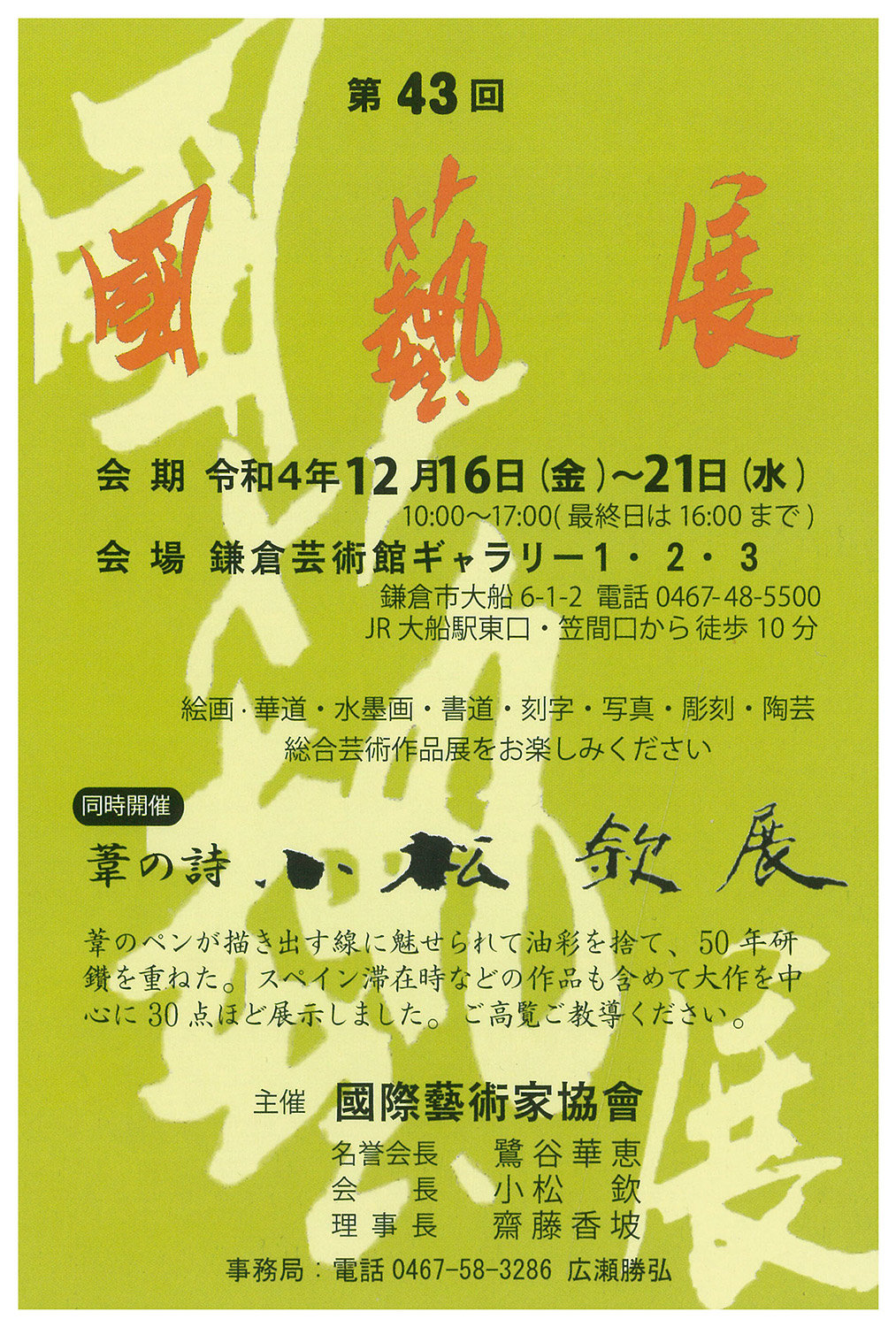 | 展覧会名 会期 会場 団体・代表名 | 第43回國藝展 12月16日(金)~12月21日(水) 鎌倉芸術館 國際藝術家協會・齋藤香坡 |