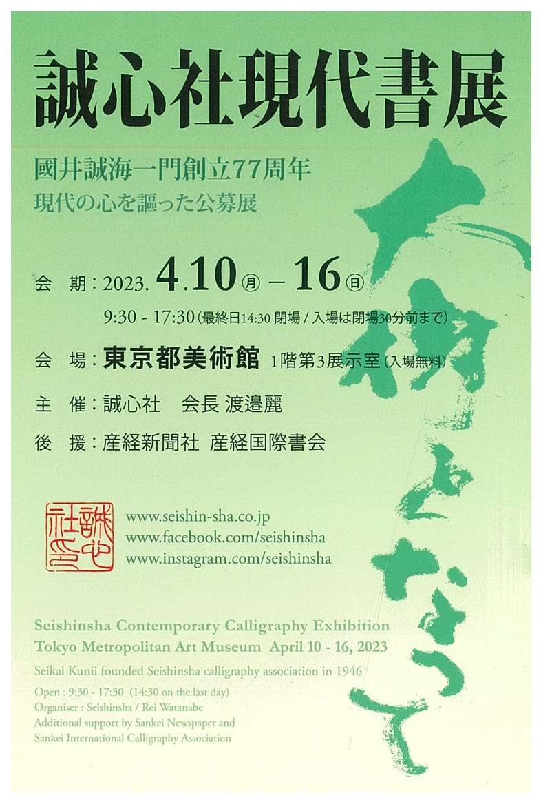 | 展覧会名 会期 会場 団体・代表名 | 誠心社現代書展 國井誠海一門創立77周年 4月10日(月)~4月16日(日) 東京都美術館 誠心社・渡邉麗 |