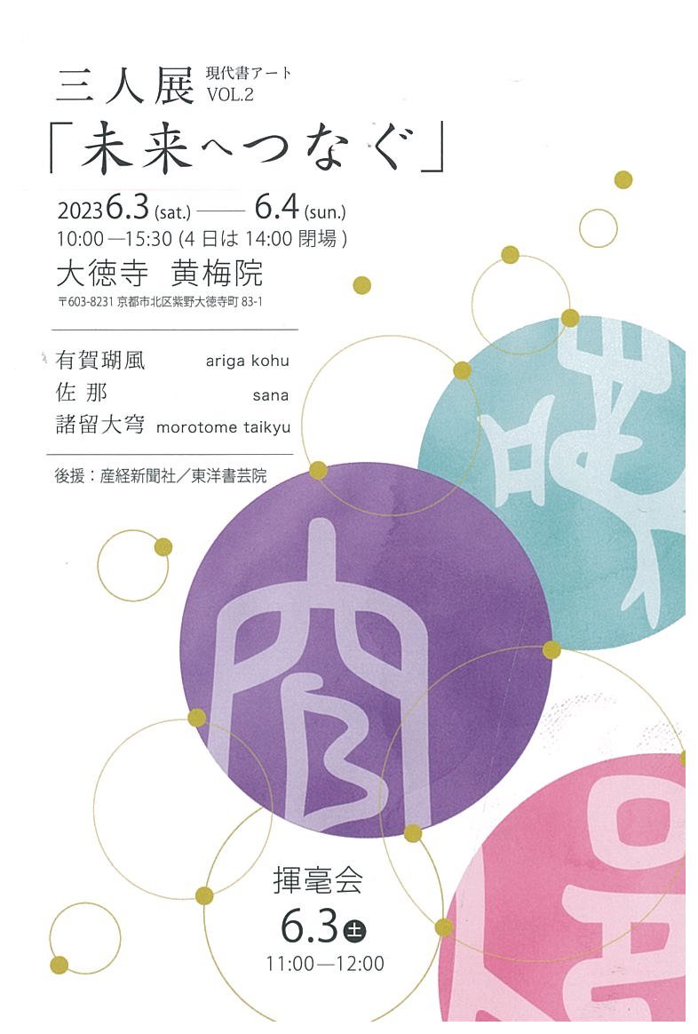 | 展覧会名 会期 会場 団体・代表名 | 現代書アート 三人展 6月3日(土)~6月4日(日) 大徳寺 黄梅院 諸留大穹 |