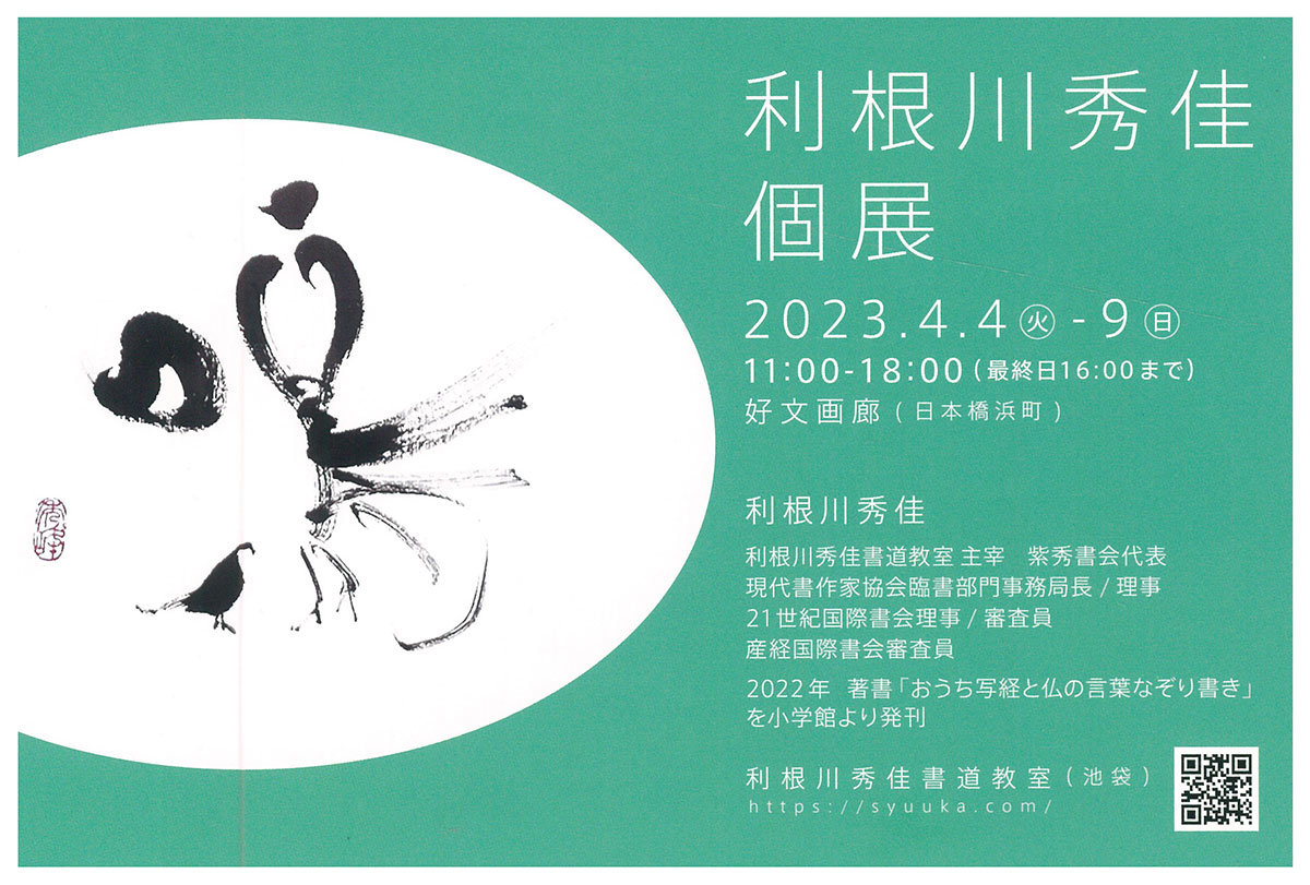 | 展覧会名 会期 会場 団体・代表名 | 利根川秀佳個展 4月4日(火)~4月9日(日) 好文画廊 紫芳書会・利根川秀佳 |