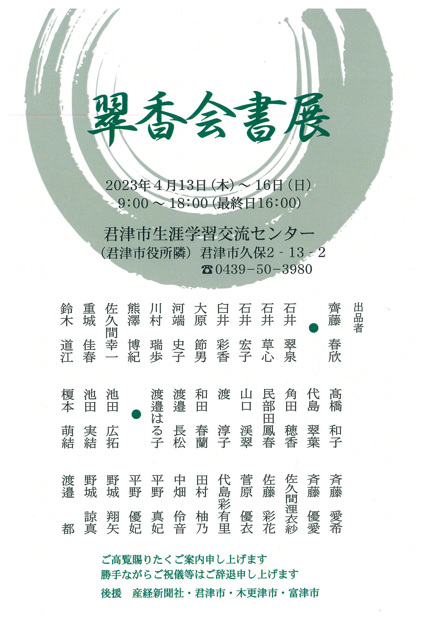 | 展覧会名 会期 会場 団体・代表名 | 翠香会書展 4月13日(木)~4月16日(日) 君津市生涯学習交流センター 翠香会・齊藤春欣 |
