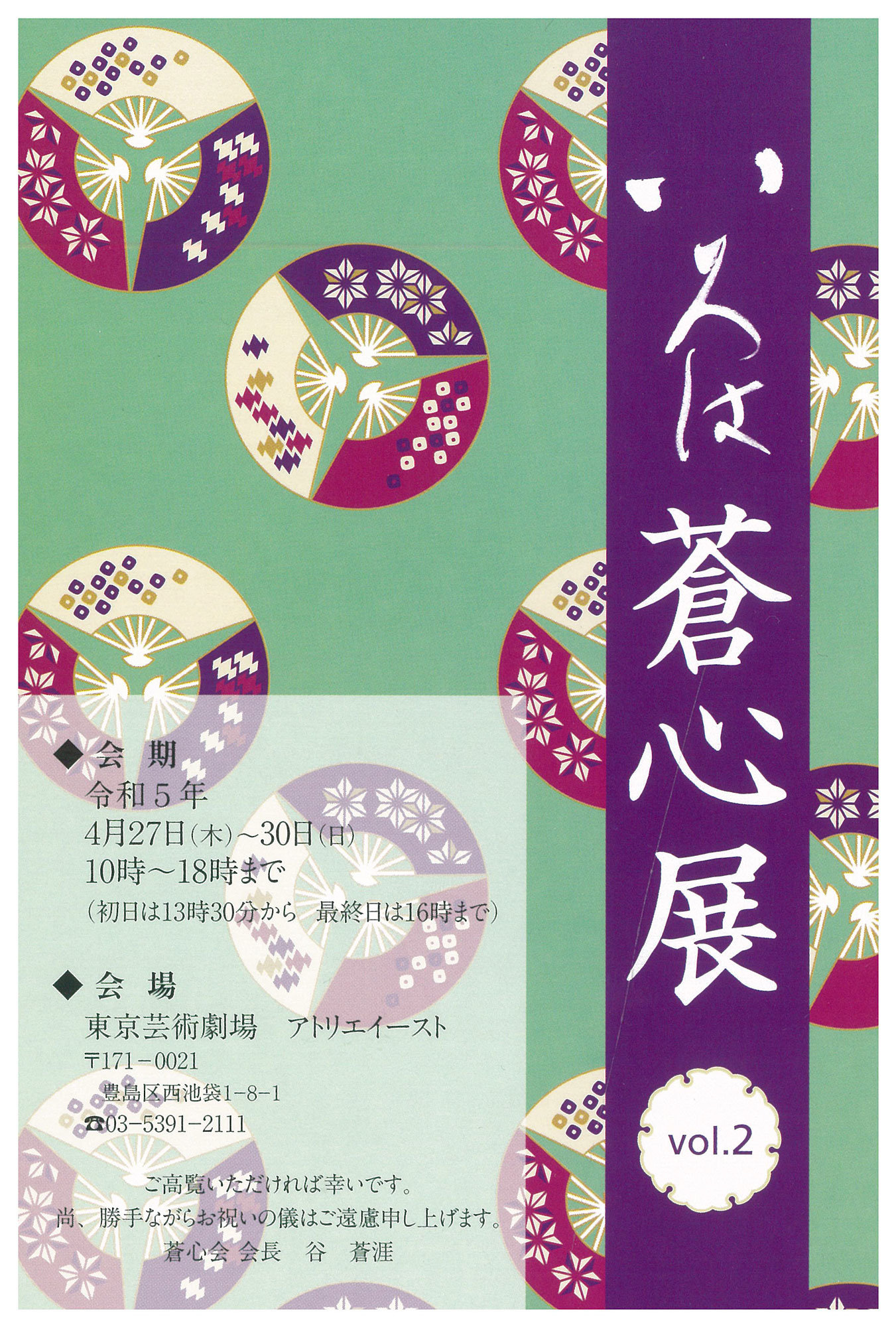 | 展覧会名 会期 会場 団体・代表名 | いろは蒼心展 vol.2 4月27日(木)~4月30日(日) 東京芸術劇場 アトリエイースト 蒼心会・谷蒼涯 |