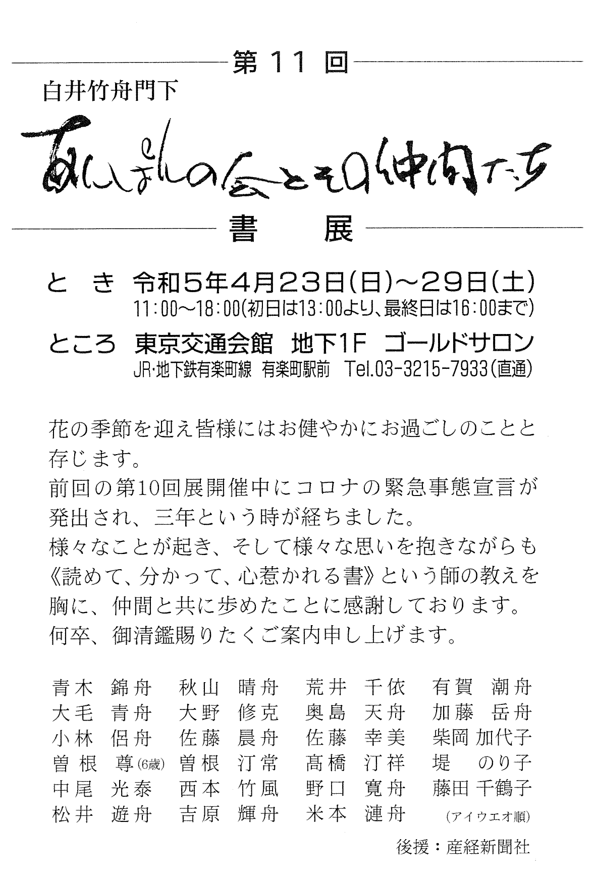 | 展覧会名 会期 会場 団体・代表名 | 第11回 あんぱんの会とその仲間たち書展 4月23日(日)~4月29日(土・祝) 東京交通会館 地下1階ゴールドサロン あんぱんの会・青木錦舟 |