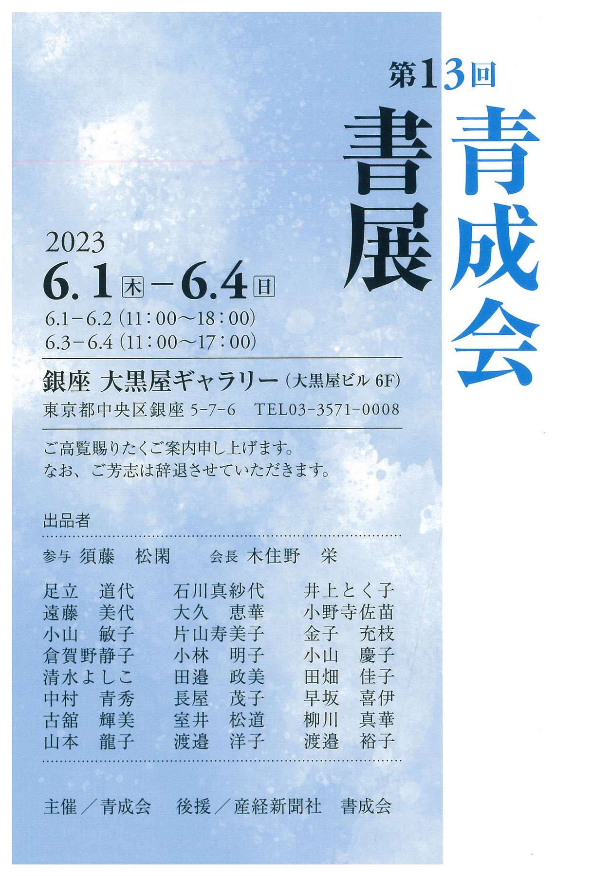 | 展覧会名 会期 会場 団体・代表名 | 第13回青成会書展 6月1日(木)~6月4日(日) 銀座大黒屋ギャラリー 青成会・木住野栄 |