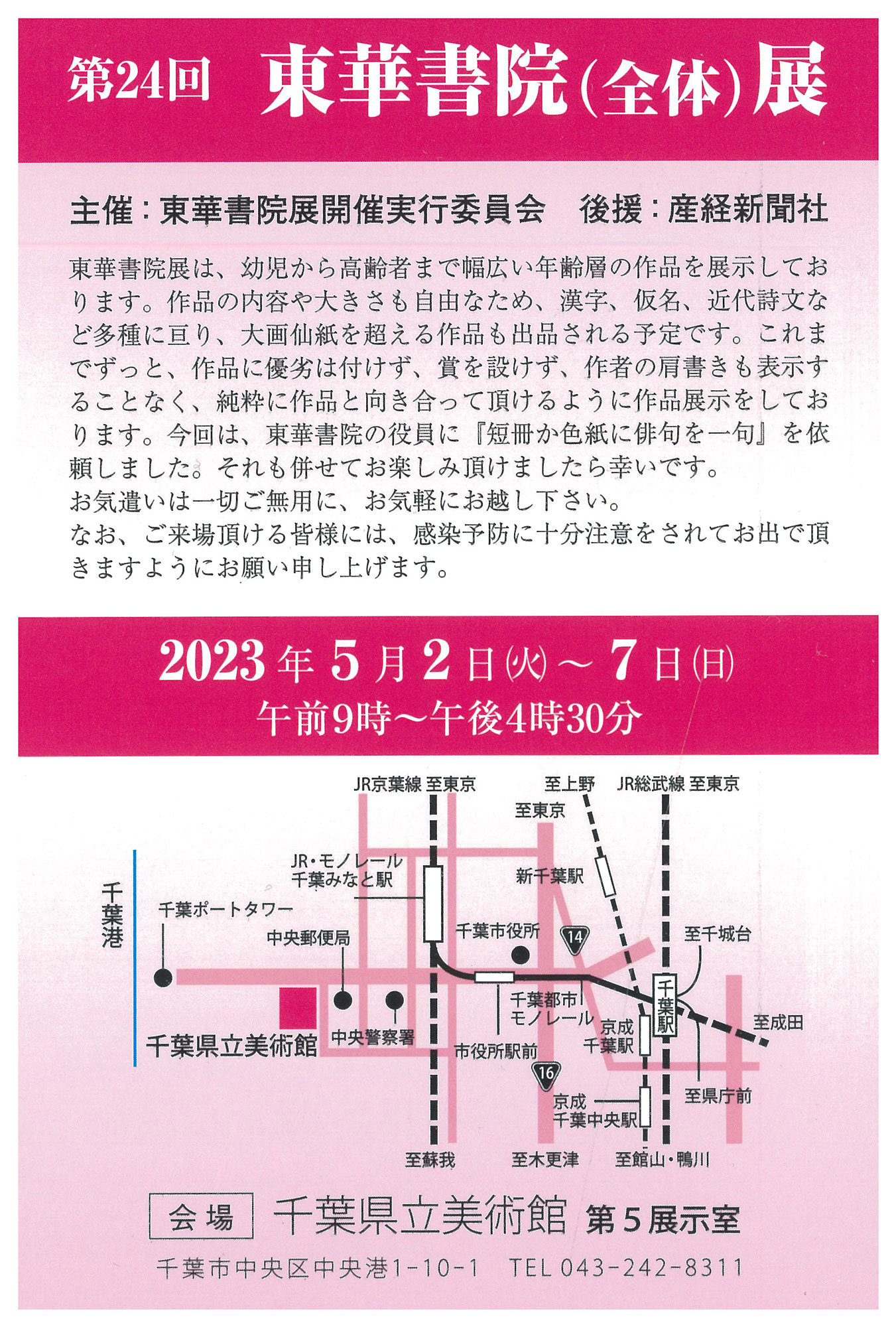 | 展覧会名 会期 会場 団体・代表名 | 第24回東華書院展 5月2日(火)~5月7日(日) 千葉県立美術館 東華書院・齊藤華秀 |