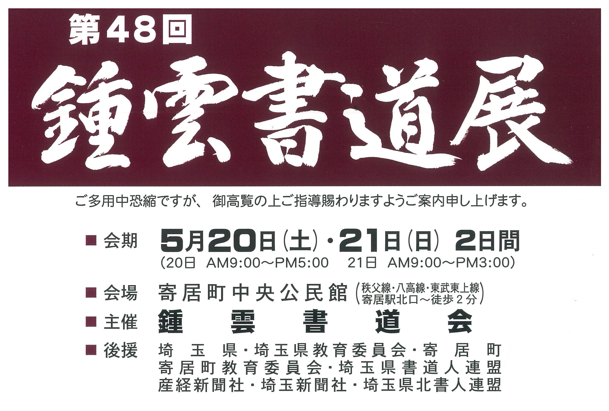 | 展覧会名 会期 会場 団体・代表名 | 第48回鍾雲書道展 5月20日(土)~5月21日(日) 寄居町中央公民館 鍾雲書道会・大澤芳洲 |
