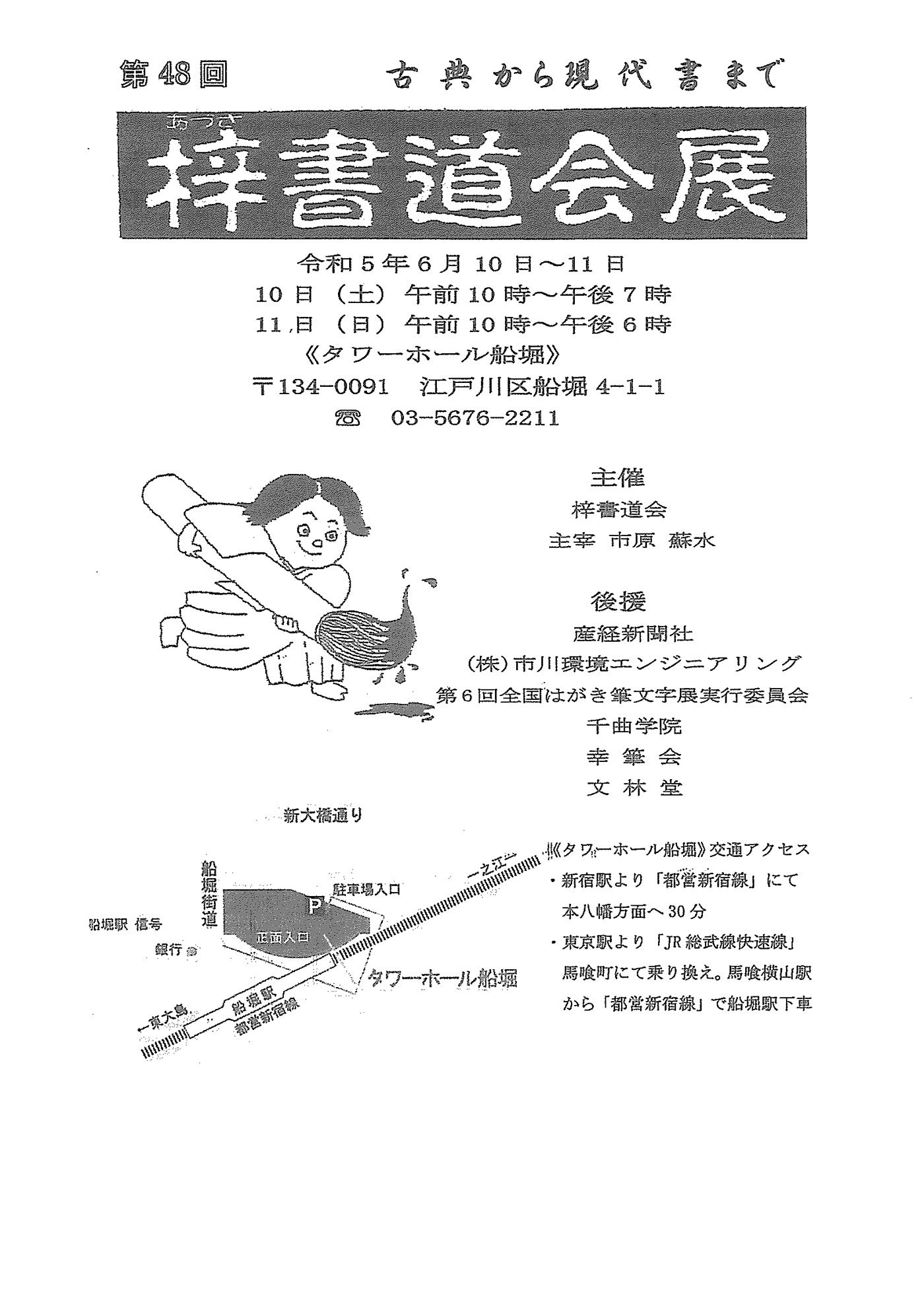 | 展覧会名 会期 会場 団体・代表名 | 第48回梓書道会展 6月10日(土)~6月11日(日) タワーホール船堀 梓書道会・市原蘇水 |