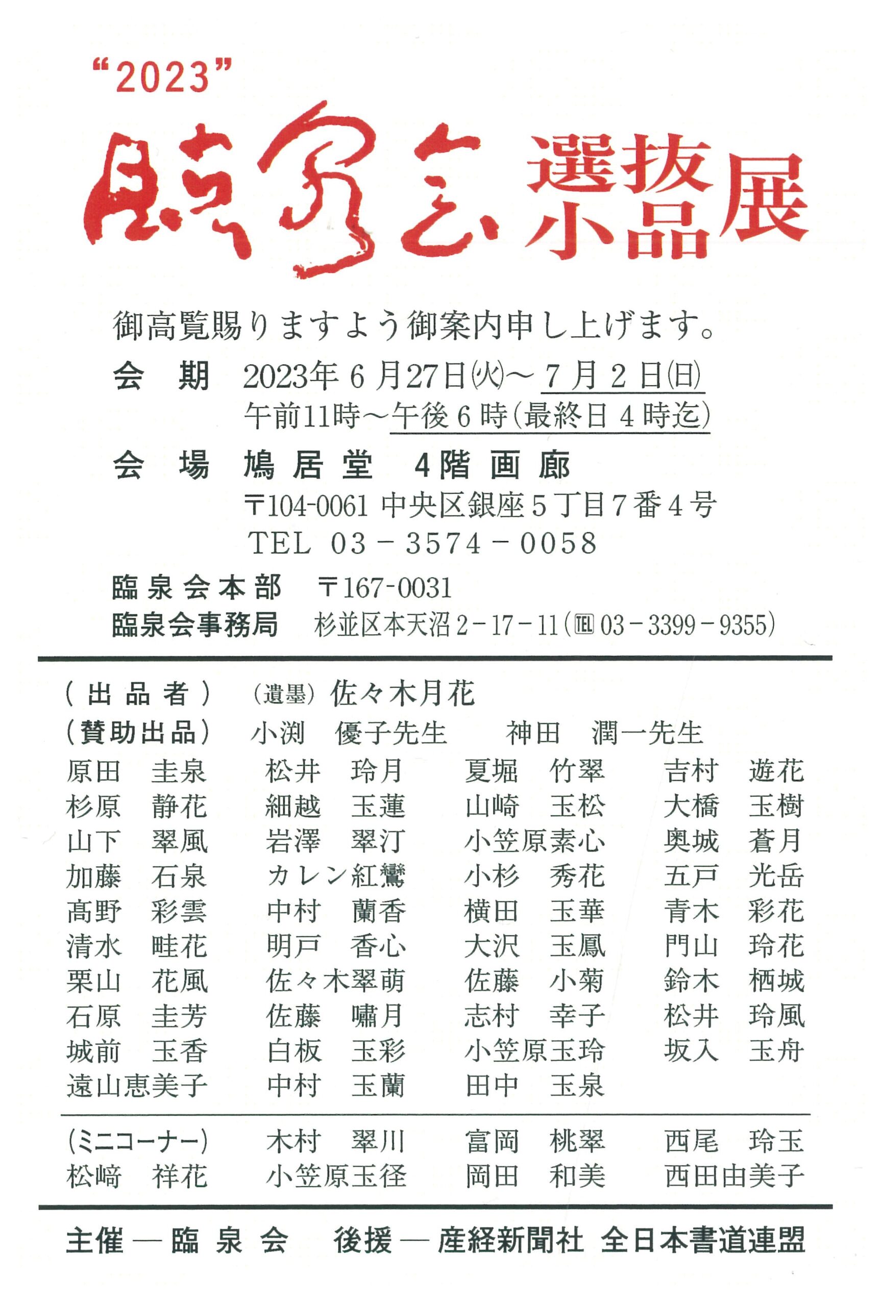 | 展覧会名 会期 会場 団体・代表名 | 2023臨泉会選抜小品展 6月27日(火)~7月2日(日) 銀座鳩居堂画廊・4階 臨泉会・原田圭泉 |