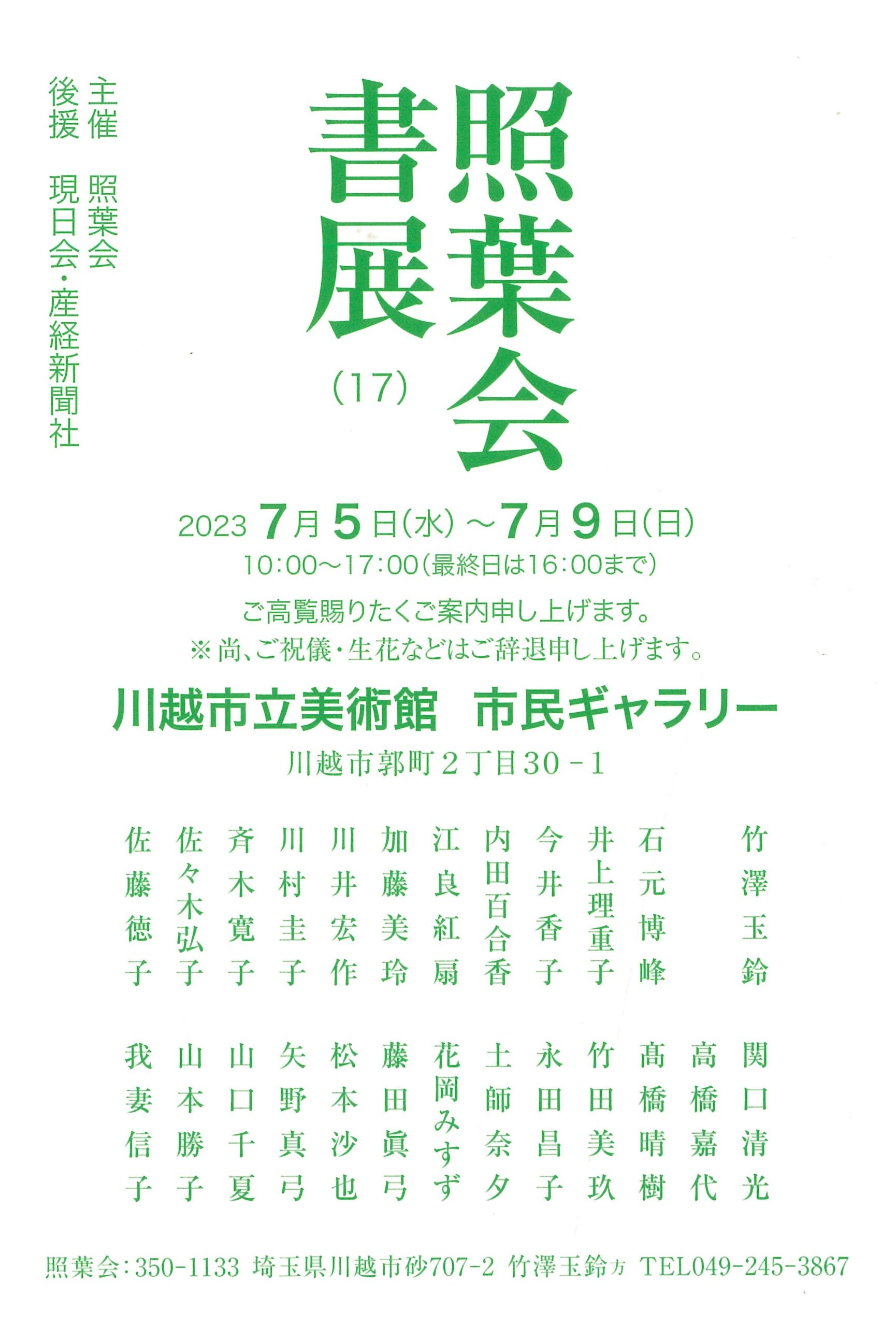 | 展覧会名 会期 会場 団体・代表名 | 第17回照葉会書展 7月5日(水)~7月9日(日) 川越市立美術館 市民ギャラリー 照葉会・竹澤玉鈴 |