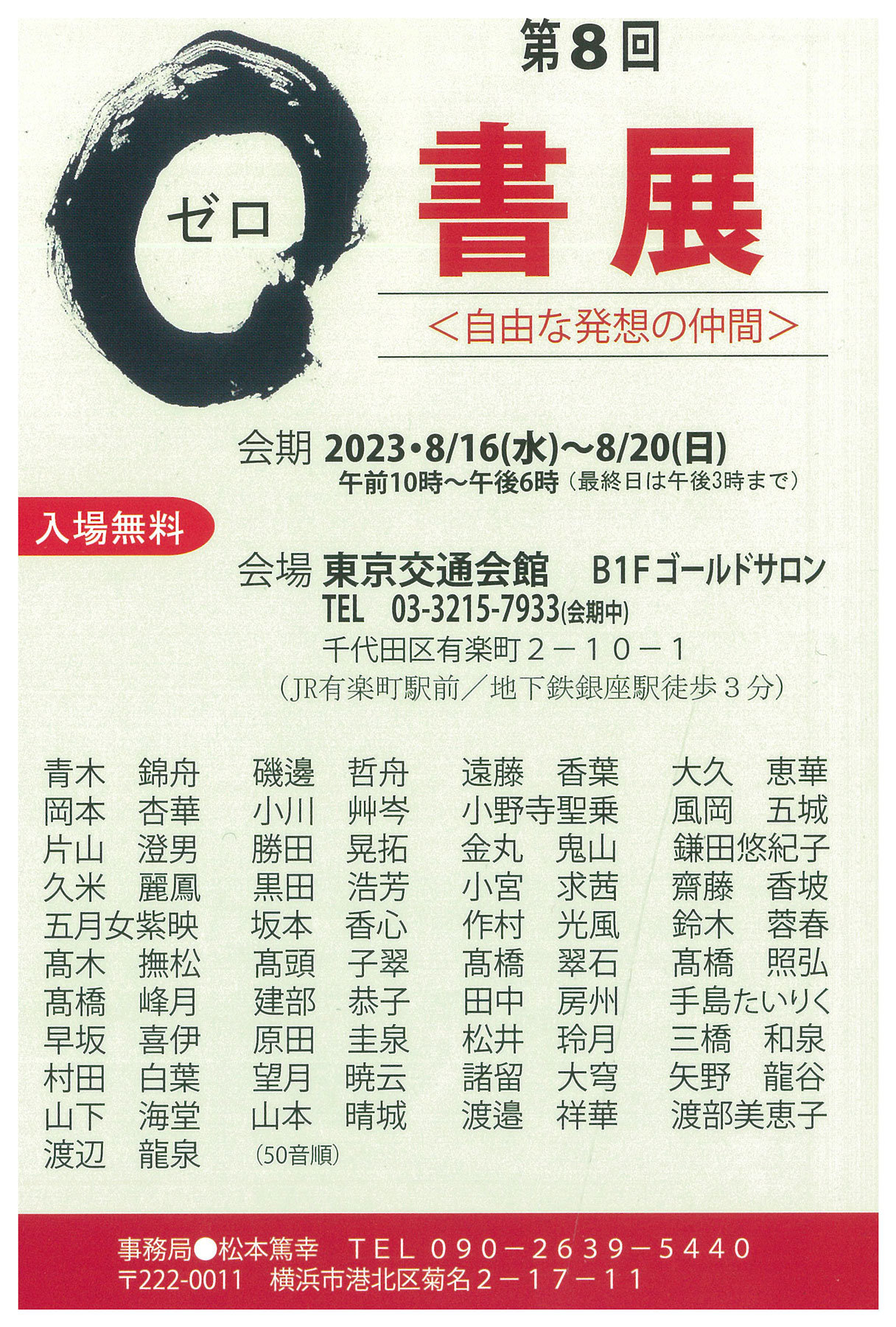 | 展覧会名 会期 会場 団体・代表名 | 第8回ゼロ書展 8月16日(水)~8月20日(日) 東京交通会館 ゴールドサロン ゼロ書展事務局 |